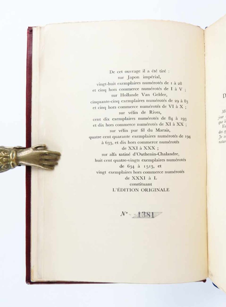 LIBRO Prima edizione. Ottimo esemplare a pieni margini con i piatti della copertina originale conservati entro legatura: il n. 1381 nella tiratura delle 880 copie su «alfa satiné d’Outhenin-Chalandre». Ex libris Marcel Morand Reiff. Cfr. Talvart - Place, Bibliographie des auteurs modernes de langue française, 39