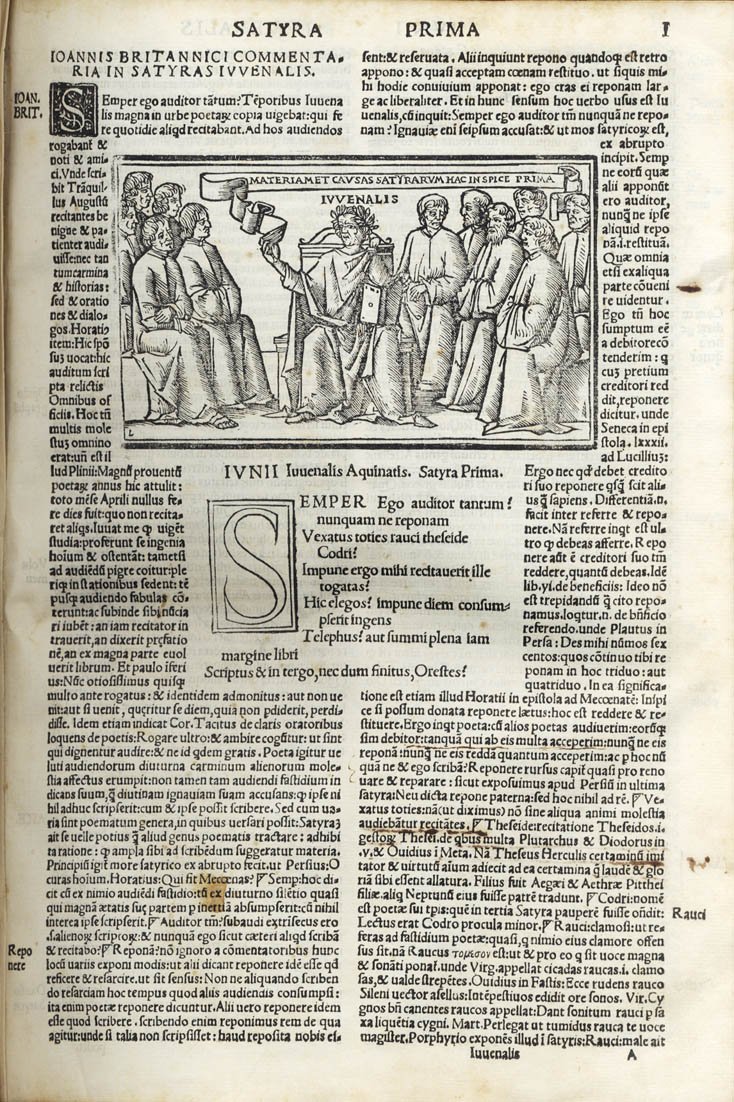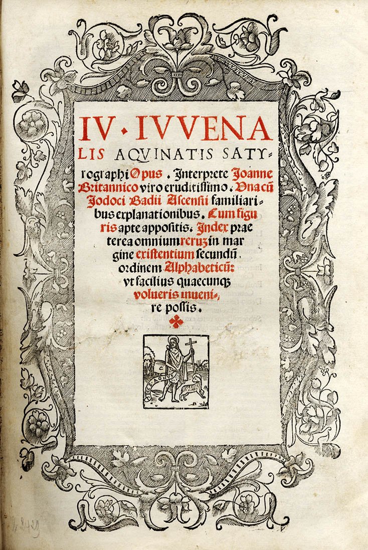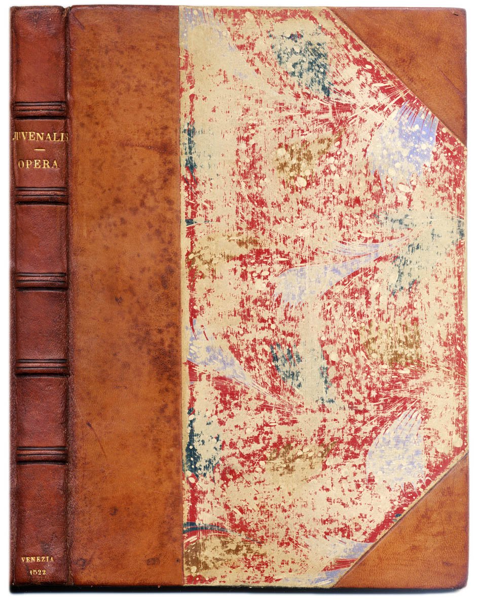 >in-folio (mm 297 x 203), ff. (6), CLXII (segn.: A-T8, V10). Leg. moderna in mezza pelle e angoli, tit. oro al dorso a nervi. Testo in carattere romano di modulo variabile su due colonne di 70 linee, titolo in carattere gotico in inchiostro rosso e nero entro larga bordura silografica, al centro della pagina impresa edit. raffigurante S. Giovanni Battista e l'Agnello con il motto "Ecce Agnus". Sedici vignette silografiche di varie dimensioni, tratte dall'edizione del 1512, illustrano gli incipit delle singole Satire. Bella e non comune edizione con il commento del Britannico (1462-1518) e di Bade Josse (1462-1535). Precede l'opera un puntuale indice; il commento del Britannico (apparso per la prima volta nel 1501) "per tutto il secolo... [fu] preferito a quello di altri umanisti famosi" (DBIt XIV p. 342). Le Satyre in esametri del poeta satirico Giovenale (55-135 d.C.) apparvero per la prima volta a Roma nel 1496 e conobbero un notevole successo editoriale. Rara edizione. Buon esemplare. Sander II, 3739. Essling 792. Cat. Olschki 4717. STC altre ediz. Adams J-758.