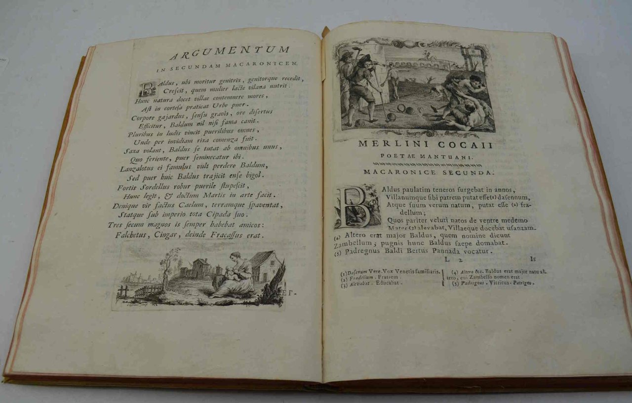 Due volumi di cm. 28,5, pp. (4) (8) lv (1) 307 (19); (6) 411 (1). Primo frontespizio in rosso e nero, ritratto del Folengo all'antiporta, un albero genealogico ripiegato e 76 figure ad un terzo ed a mezza pagina in luogo di testate e finali. Il tutto finemente inciso in rame. Legatura strettamente coeva in piena pergamena rigida con nervi passanti e titoli i oro su tasselli ai dorsi. Bell'esemplare, pulito e genuino, assai marginoso (in barbe). Le carte preliminari contengono lunghe notizie biografiche sul Folengo ed il catalogo delle sue opere. Si tratta decisamente dell'edizione più bella delle opere del Folengo, munita poi di un ampio apparato di note erudite (cfr. Brunet).