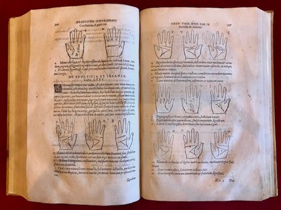 Folio (cm. 30), 6 cc.nn., 624 pp., 4 cc.nn. (di cui l’ultima bianca). Con innumerevoli illustrazioni xilografiche raffiguranti mani e dita chiromantiche, allegorie dei pianeti, volti umani e schemi astrologici. Marca tipografica al frontespizio, ritratto dell’Autore al verso del frontis., ripetuto in fine. Legatura antica in pergamena rigida (alcune macchie). Timbretti di collezione privata (’Kristen Collection’) al contropiatto anteriore e al verso del frontespizio. Leggere ossidazioni diffuse, peraltro esemplare in ottimo stato di conservazione. Seconda rara edizione dopo la prima pubblicata nel 1562. L’Autore, nato in Belgio nel 1509, fu presso la Corte di Carlo V dal 1530 al 1550, che accompagnò a Tunisi nel 1535 e più tardi in Italia. Insegnò matematica a Palermo, Roma e Ferrara. Diede alla luce quest’opera a Colonia, dove si era ritirato nel 1558, dopo la morte di Carlo V. Scrisse anche di geometria e magnetismo. Cfr. Bibliotheca Magica Casanatense, 1160; Caillet, 10524; Cantamessa (‘Biblioastrology’ n. 7841): ‘La parte dedicata alla chiromanzia può considerarsi opera a sé e probabilmente la più documentata e analitica tra tutte quelle che sono state scritte sul tema’.