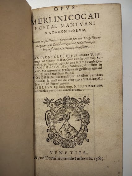 Opus Merlini Cocaii poetae mantuani macaronicorum Totum in pristinam formam per me Magistrum Acquarium Lodolam optime redactum, in his infra notatus titulis divisum Zanitonella, Phanthasiae, Moschaeae, Libellus