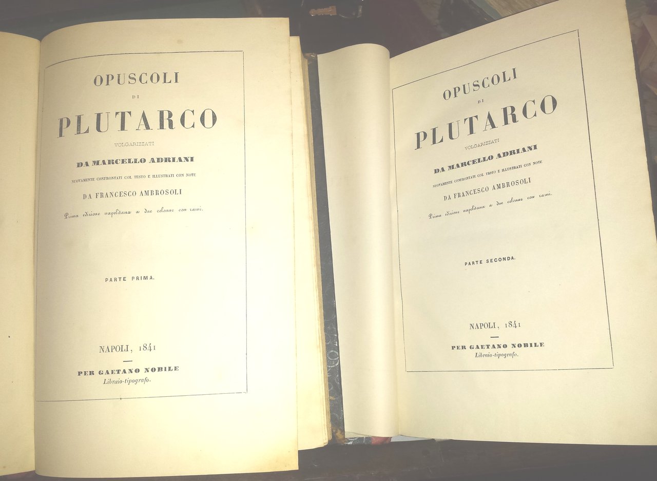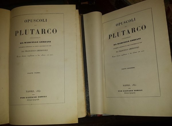 Opuscoli di Plutarco volgarizzati da Marcello Adriani; nuovamente confrontati col testo e illustrati con note da Francesco Ambrosoli. Prima edizione napolitana a due colonne con rami.