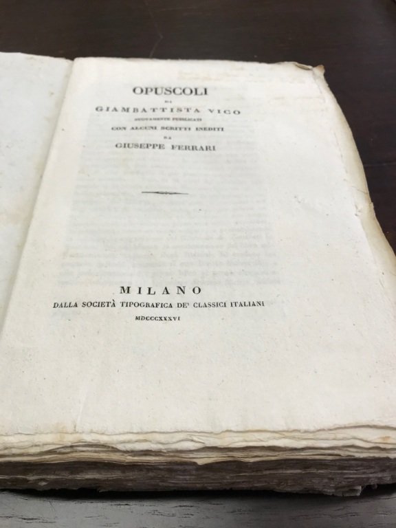 In-8° (cm. 22), brossura coeva con titolo a stampa su tassello al dorso, pp. XVI 480 [3] in barbe e in ottimo stato, con 1 tavola illustrativa f.t.; lievi fioriture sparse, occhietto parzialmente incollato alla brossura e con note antiche. Collana delle Opere di Vico. Buon esemplare. (NF9)