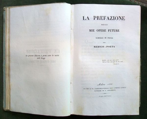 Otto parti in un volume in 8°, pp. 82, (2), 48, 80, 52, 32, 166, (2), 174, (2), 56. Contiene: L'arte poetica di Quinto Orazio Flacco esposta in dialetto milanese. Milano, Sambrunico - Vismara, 1836. L'avarizia, satira prima di Quinto Orazio Flacco esposta in dialetto milanese. 1837. La prefazione delle mie opere future. scherzo in prosa del medio - poeta. 1838. L'arte di ereditare, satira v del libro II di Q. Orazio Flacco esposta in dialetto milanese dal medio - poeta. 1839. Le strade ferrate. sestine milanesi del medico - poeta. Milano, Guglielmini, 1840. Il volgo e la medicina. discorso popolare del medico - poeta. 1840. Appendice all'opuscolo il volgo e la medicina, altro discorso popolare del dottore. Milano, Bernardoni, 1841. Amicizia e tolleranza. satira di Q. Orazio Flacco esposta in dialetto milanese dal dottore. , Milano, Bernardoni, 1841. Cartonatura originale azzurra con titoli a stampa. Copertina con segni di polvere e una grande macchia d'inchiostro. Per il resto buone condizioni.
