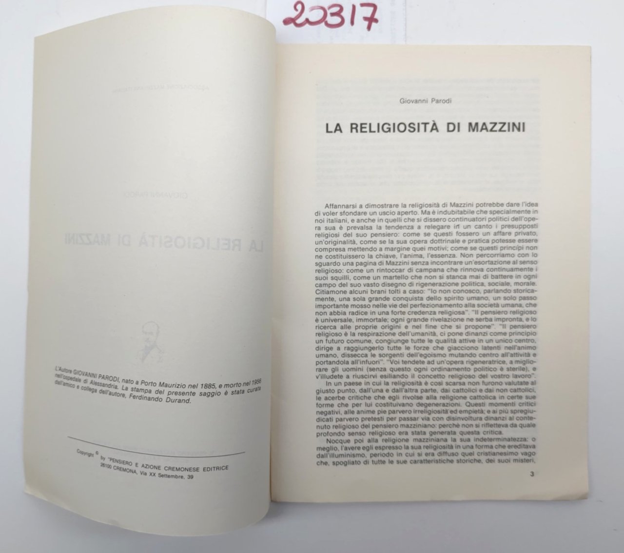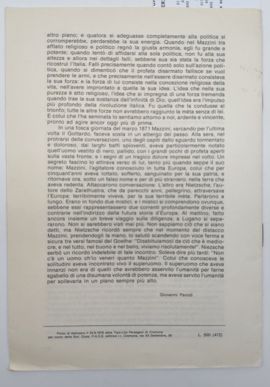opuscolo Giovanni Parodi La religiosità di Mazzini il pensiero mazziniano 1978 P.A.C.E