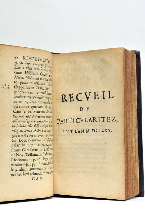 2 ouvrages en 1 volume. 1). 6 feuillets. 282 pages. 1 feuillet. 2). 96 pages. (13,5x 8 Cm). Veau brun. Dos à nerfs orné. Reliure de l'époque. Charnières légèrement fendues. 1). Recueil d'écrits sur divers sujets de l'écrivain Paul Colomies né à La Rochelle d'une famille d'origine toulousaine. Il s'était lié d'amitié avec le savant Vossius et devint le bibliothécaire, à Londres, de l'archevêque de Cantorbery. 2). Un grand nombre des textes de ces "Mélanges" concernent les livres (indications bibliographiques ou de bibliophile, histoires ou anecdotes concernant des livres ou des auteurs, souvent célèbres, recherches sur des livres anonymes, etc.). Ex-libris manuscrit sur le premier ouvrage "C. Antonin ponti royanis". Taches et rousseurs éparses. Papier bruni. Bon exemplaire.