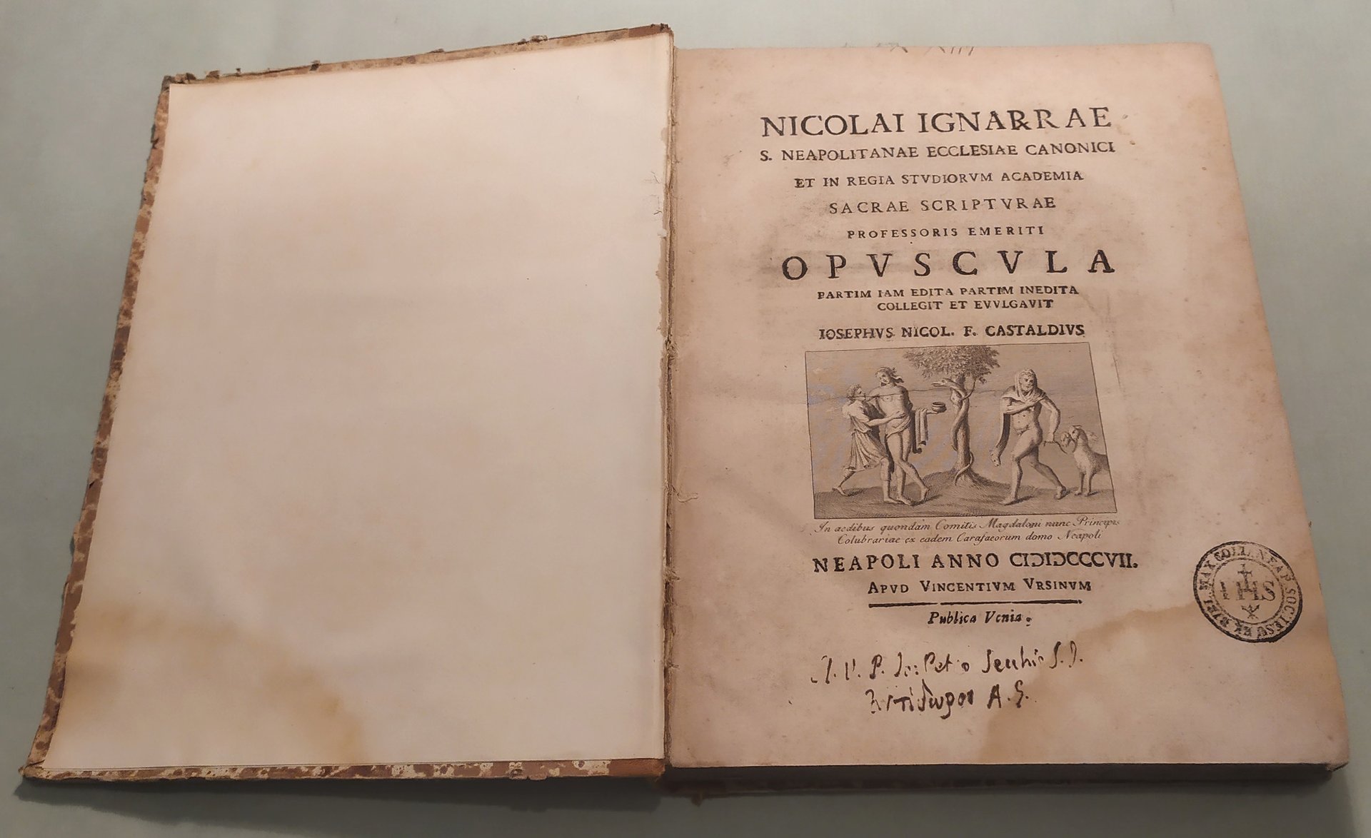 Neapoli, apud Vincentium Ursinum, 1807. In 8vo; pp. XXIV,371. Vignetta tipografica l frontespizio ed in fine. Mezza pelle, lacerazioni ai piatti. Tracce d’umido. Varie monografie: Graecorum Epigrammatum, De inscriptione Graeca Heraclea reperta, Recensio actorum S.Ianuarii.