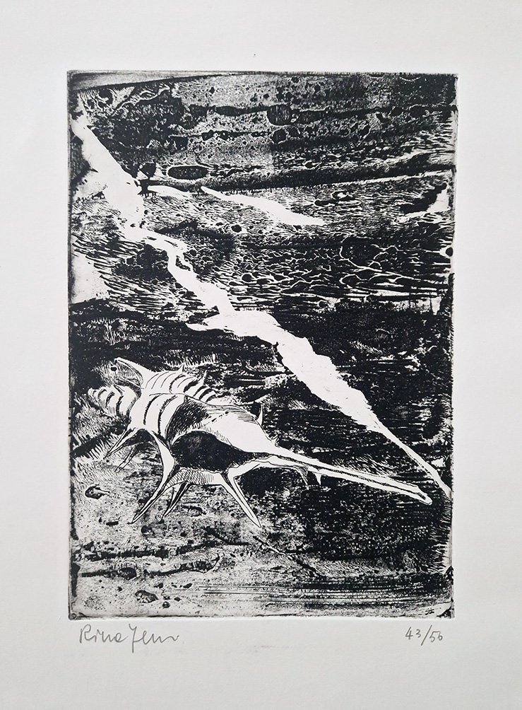 In folio; pp. non num. 4 con testo a quartini sciolti; seguono le cinque grafiche dell'Artista num. e firmate a matita inserite, ognuna, in un quartino con una poesia dell'Autore. Cartella t.tela edit. con titoli al piatto. Bella edizione limitata a 50 esemplari numerati oltre a X numerazione romana. <BR>(vedi riproduz.)