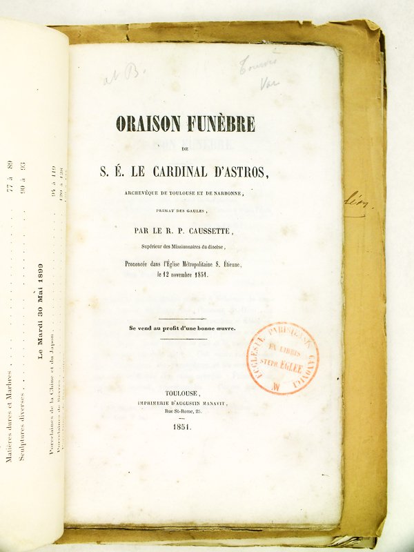 Oraison funèbre de S.E. le Cardinal d'Astros, Archevêque de Toulouse et de Narbonne, Primat des Gaules. Prononcée dans l'Eglise Métropolitaine S. Etienne, le 12 novembre 1851. [ On joint un extrait de du Correspondant de 1889 : ] L'Abbé d'Astros et Napoléon d'après des Documents inédits.