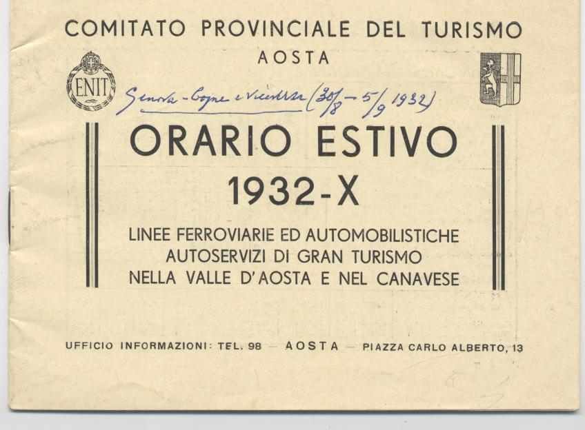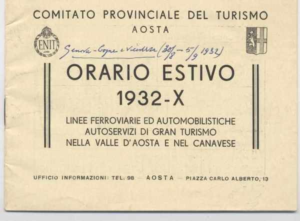 Orario estivo 1932 - Linee ferroviarie ed automobilistiche autoservizi di gran turismo nella Valle d'Aosta e nel Canavese