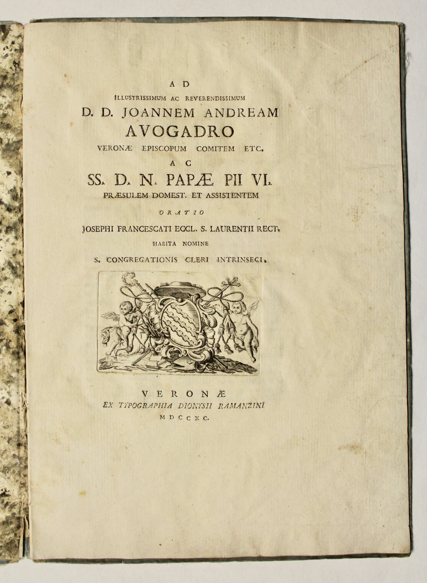 Oratio…abita nomine S. Congregationis cleri intrinseci. Dedicata a Giovanni Andrea Avogadro, Vescovo di Verona.