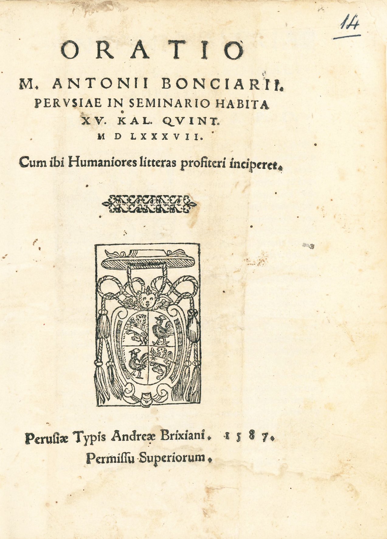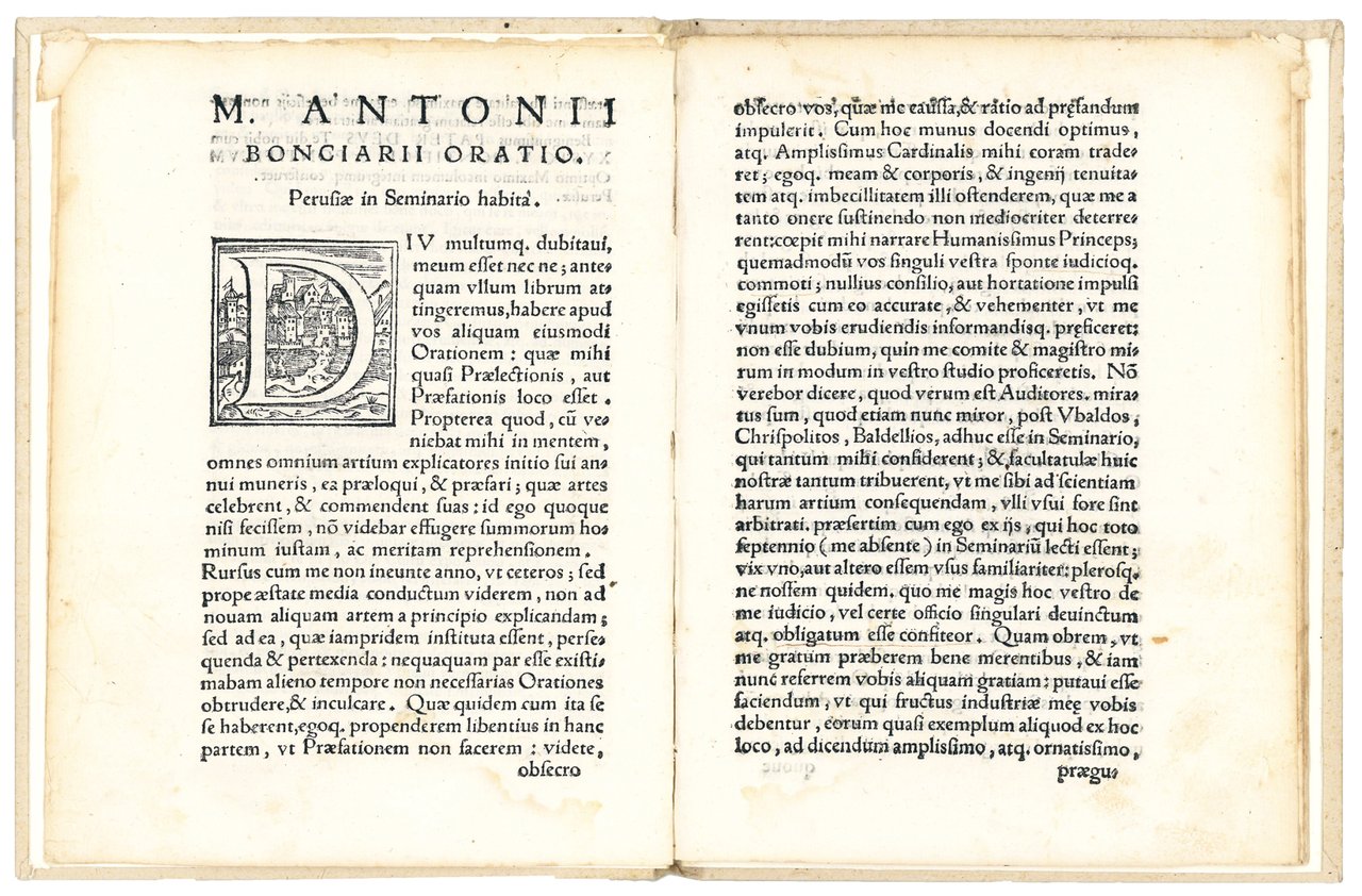 First edition of this academic oration held at the Perugia seminary in 1587 on the occasion of the renewal of the chair of humanities first awarded to Bonciari in 1576.