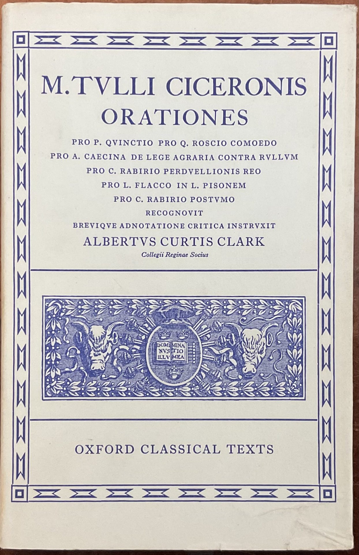 Orationes. Pro P. Quinctio, Pro Q. Roscio Comoedo, Pro A. Caecina, De lege agraria contra rullum, Pro C. Rabirio Perduellionis reo, Pro I. Flacco, in L. Pisonem, Pro C. Rabirio postumo. Recognovit Albertus Curtis Clark
