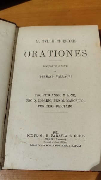 Libro scritto dall'avvocato Marco Tullio Cicerone, edizione del 1891 con recensioni e note di Tommaso Vallari. Pubblicato dalla casa editrice G.B. Paravia e comp. Buone condizioni con segni di uso e del tempo.