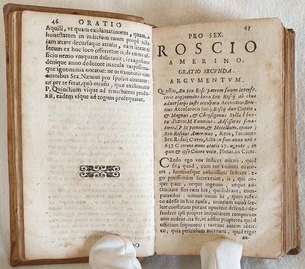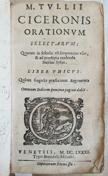 Rara edizione del 1681 di questa raccolta di orazioni di Marco Tullio Cicerone.<BR>All'interno: Pro P. Quinctio, Pro Sext. Roscio Amerino, In verrem prima, Pro lege Manilia, De lege agraria ad populum, In catilinam altera, Pro archia Poeta, Ad Quirites post reditum, Post reditum in senatu, Pro domo sua ad Pontifices, Pro Cn. Plancio, In L. Pisonem, Pro T. Annio Milone ecc.<BR>Antiche note manoscritte alla prima pagina di sguardia.<BR>In buone condizioni e completo. Copertina in piena pergamena coeva con titolo manoscritto al dorso in buone condizioni generali con usuremarginali. Legatura in buone condizioni. Pagine in buone condizioni con rare fioriture. Alcune mancanze alle sguardie. In 24. Dim. 13,5x7,5 cm. Pp. 619+(1).Scarce edition of 1681 of this collection of orations written by Marco Tullio Cicerone. Inside: Pro P. Quinctio, Pro Sext. Roscio Amerino, In verrem prima, Pro lege Manilia, De lege agraria ad populum, In catilinam altera, Pro archia Poeta, Ad Quirites post reditum, Post reditum in senatu, Pro domo sua ad Pontifices, Pro Cn. Plancio, In L. Pisonem, Pro T. Annio Milone etc. Antique handwritten notes in the first endpage. In good conditions and complete. Full parchment coeval cover with handwritten title in the spine in good general conditions with wearings in the extremities. Binding in good conditions. Inside pages are in good conditions with occasional foxing. Some parts lacking in the endpages. In 24. Dim. 13,5x7,5 cm. Pp. 619+(1).