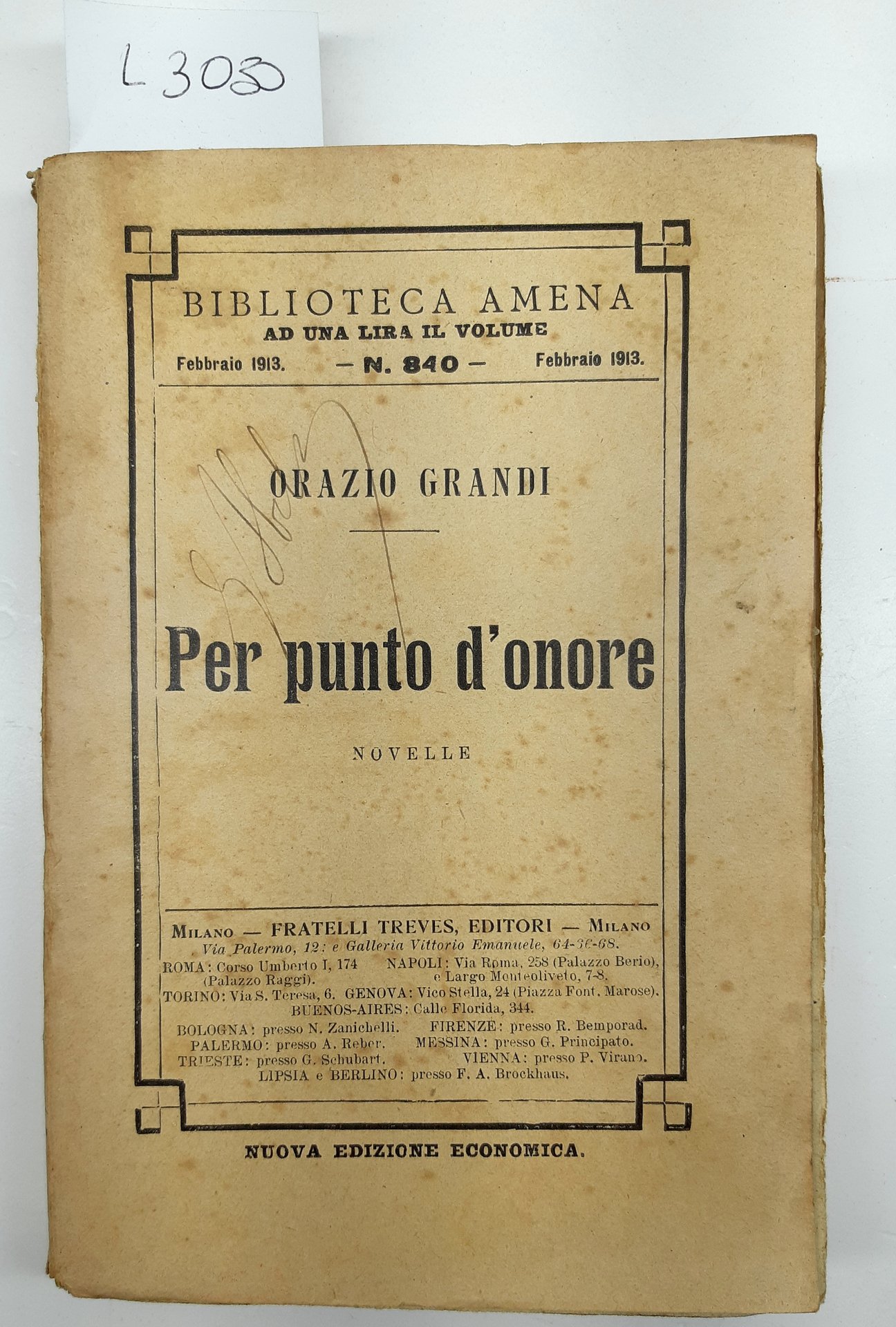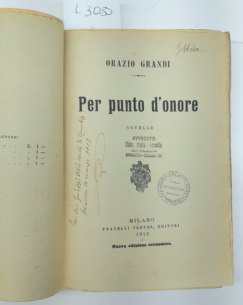Orazio Grandi Per punto d'onore novelle Treves 1913 Abela Carboneria