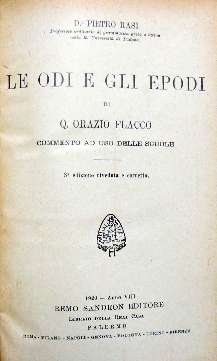 Pietro Rasi, Le Odi e gli Epodi di Q. Orazio Flacco. Commento ad uso delle scuole, Remo Sandron Editore Libraio della Real Casa, Palermo 1929, terza ed. riveduta e corretta, pp. XXXVIII, 378, cm 19, legatura coeva in mezza tela con titoli in oro al dorso e angoli. Testo in lingua latina con introduzione, commento e apparati in lingua italiana. Indice: Prefazione alla prima edizione – Prefazione alla seconda edizione – Introduzione. Cenni sulla vita e sulle opere di Orazio – Metrica delle Odi – Metrica degli Epodi – Odi (Libro I – Libro II – Libro III – Libro IV) – Carmen Saeculare – Epodi. Minime tracce d’uso alla legatura, lieve brunitura della carta, per il resto perfetto, con interno pulito ben tenuto e legatura solida.