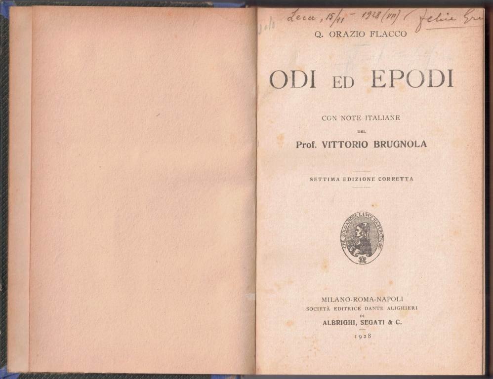 Quinto Orazio Flacco (Quintus Horatius Flaccus), Odi ed Epodi, con note italiane del Prof. Vittorio Brugnola, Società Editrice Dante Alighieri di Albrighi Segati e C., Milano-Roma-Napoli 1928, settima ed. corretta, pp. XXII, 287, testatine ill. b.n., cm 18, legatura in mezza tela blu con titoli in oro e manoscritti al dorso e angoli. Testo in lingua latina con introduzione, commento e apparati in lingua italiana. In testa al frontespizio, firma d’appartenenza, luogo e data. Tenue ombra di vecchia gora di estensione assai limitata appena visibile lungo margine superiore di parte del volume, minime fioriture, lieve brunitura della carta, per il resto bell’esemplare.