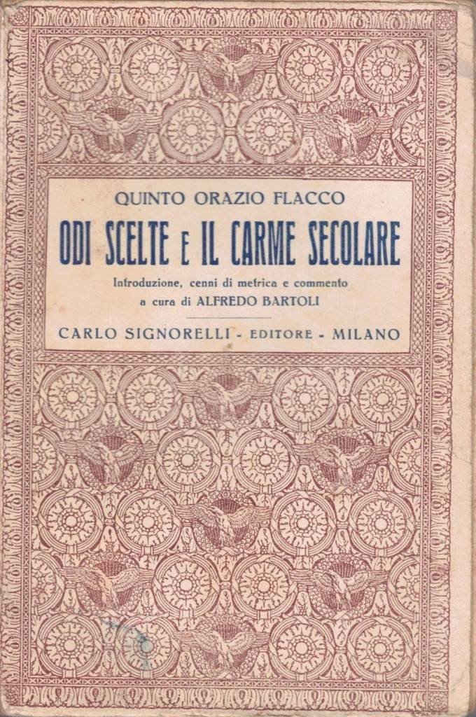 Quinto Orazio Flacco (Quintus Horatius Flaccus), Odi scelte e Il Carme Secolare, introduzione, cenni di metrica e commento a cura di Alfredo Bartoli, Carlo Signorelli Editore, Milano 1943, quarta rist. identica a quella del 1941, pp. 172, testatine ill. con fregi b.n., cm 19, br. ed. Testo in lingua latina con introduzione, commento e apparati in lingua italiana. Firma d’appartenenza a occhiello e frontespizio. Tracce d’uso, qualche sporadico segnetto di lapis, minime fioriture, leggera brunitura della carta, ma comunque buona copia, con interno integro di piena fruibilità e brossura solida.