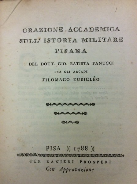 ORAZIONE ACCADEMICA SULL'ISTORIA MILITARE PISANA. - Del Dott. Gio. Battista Fanucci fra gli Arcadi Filomaco Euricleo.