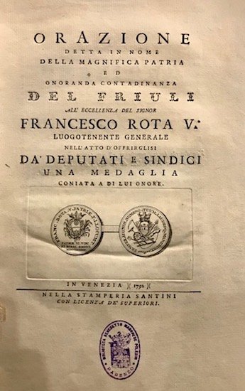 Orazione detta in nome della magnifica patria ed onoranda cittadinanza del Friuli all’eccellenza del signor Francesco Rota V. Luogotenente generale nell’atto d’offrirglisi da’ Deputati e Sindici una medaglia coniata a di lui onore