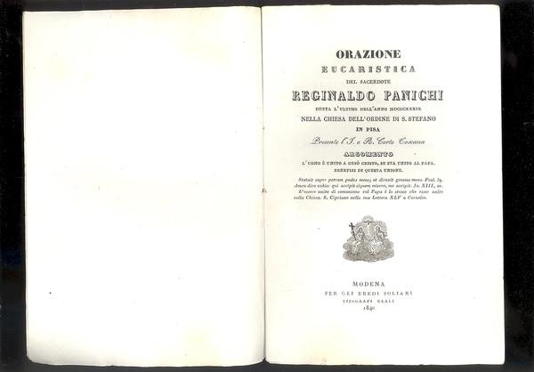 ORAZIONE EUCARISTICA DEL SACERDOTE REGINALDO PANICHI DETTA L'ULTIMO GIORNO DELL'ANNO MDCCCXXXIX NELLA CHIESA DELL'ORDINE DI S. STEFANO A PISA.