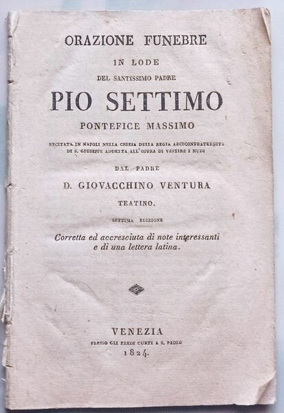 Orazione funebre in lode del santissimo padre Pio Settimo pontefice massimo. Recitata in Napoli nella chiesa dell'arciconfraternita di S. Giuseppe addetta all'opera di vestire i nudi.