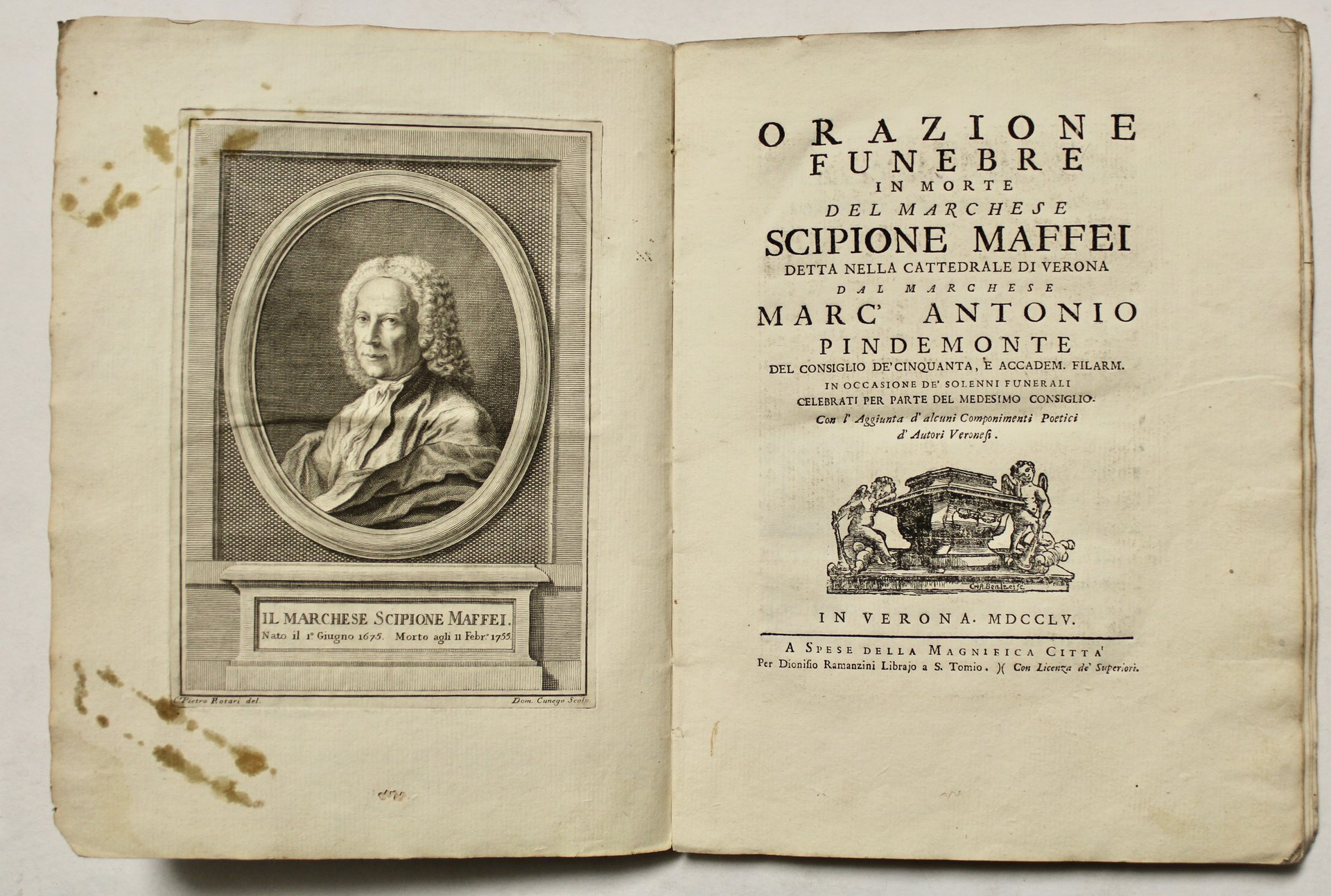 In 4° (290x218); antiporta con ritratto in rame di Scipione Maffei inciso da Domenico Cunego; pagg. XXXVIII, una carta bianca, (2), 35, una grande tav. in rame ripiegata incisa da Urbani raffigurante il monumento funebre ideato dall'architetto Cristofali; iniziali con grandi vignette e fregi silografici. Cartone di tipo marmorizzato coevo. Ottimo esemplare con alcune macchie, quasi esclusivamente marginali, oleose al ritratto ed alla tav. alla fine; lievissimo alone al marg. inf. verso la fine; dorso con tracce d'uso e piccole mancanze. <BR>