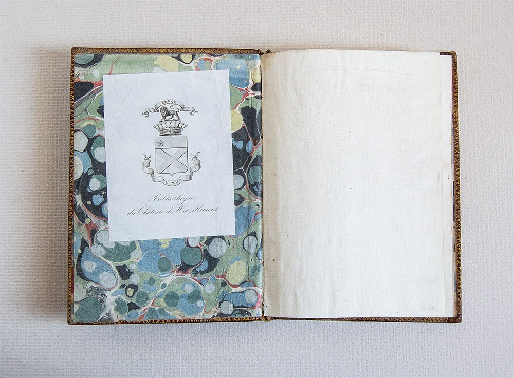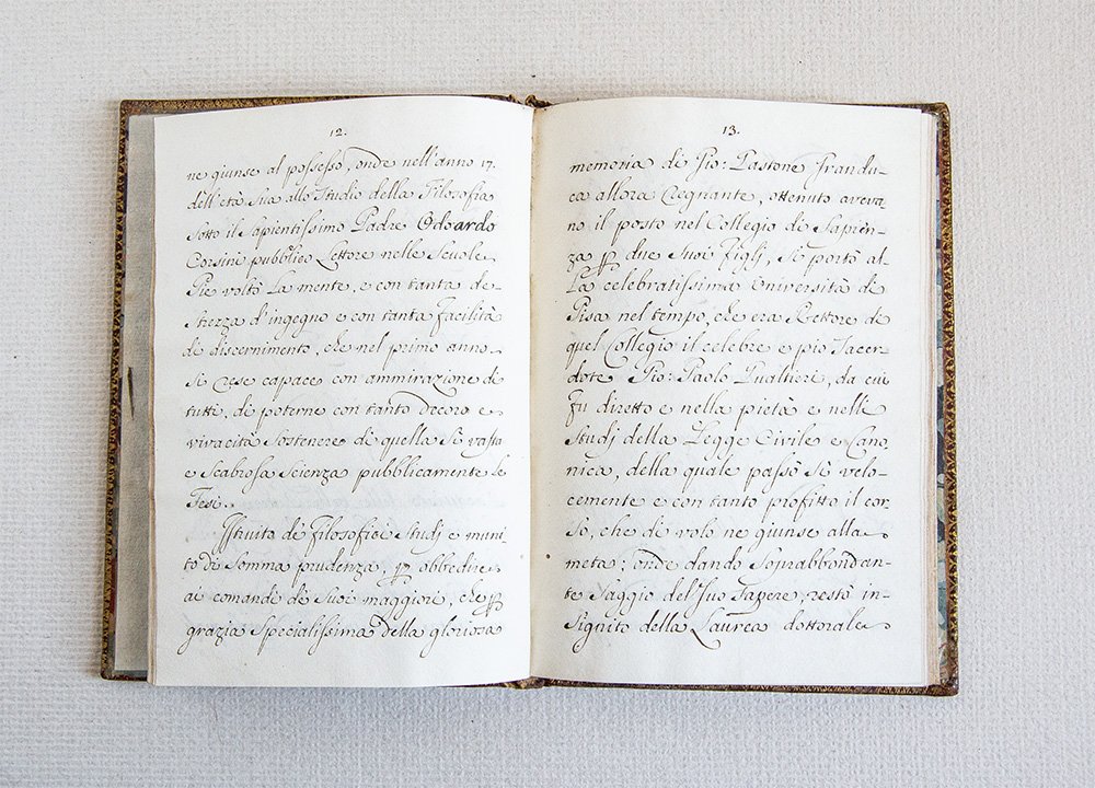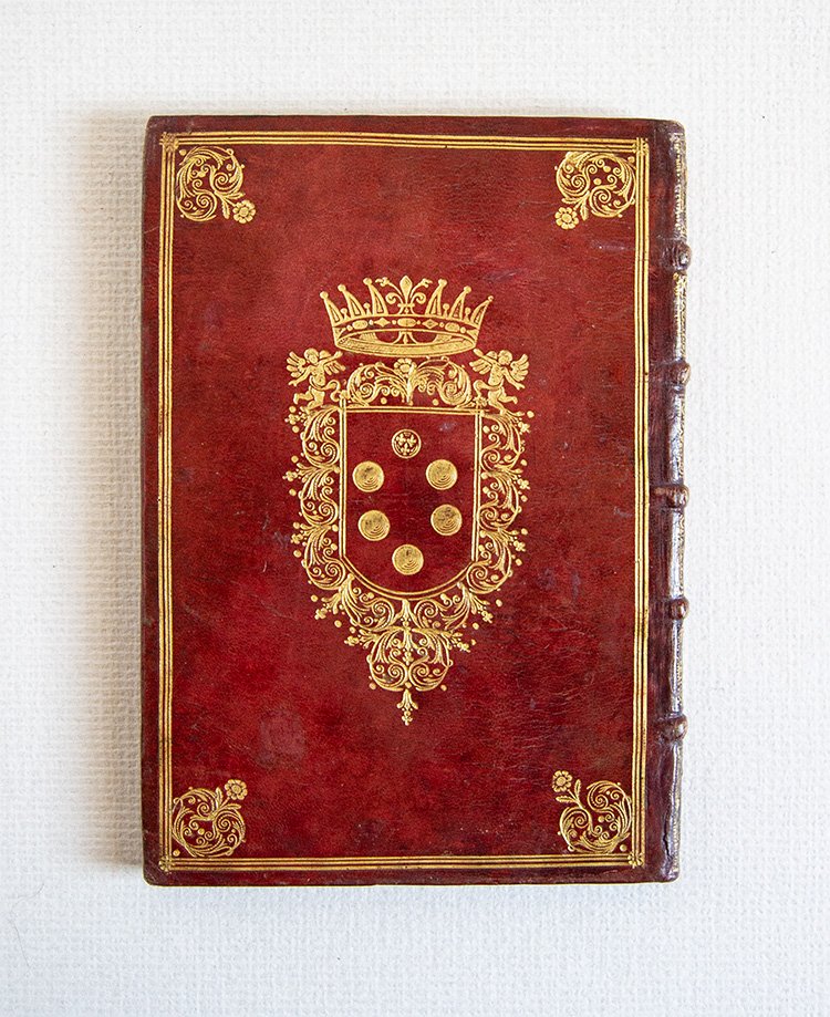 Splendida legatura del XVII secolo in pieno marocchino rosso a grana fine con cornici di triplici filetti e ferri angolari impressi in oro ai piattii; al centro di ciascun piatto grande stemma mediceo coronato, anch'esso in oro. Dentelles alle unghiatue, tagli dorati, sguardie in carta marmorizzata; decorazioni impressi ai comparti del dorso a cinque nervi. Piccoli restauri ai piatti, ma nel complesso ottime condizioni. Al contropiatto anteriore grande ex-libris cartaceo di antico proprietario. pp. (2), 43, 1 bianca e 33 carte bianche.