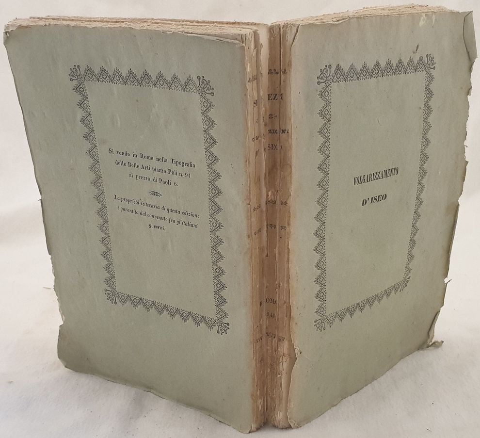 Edizione del 1844 delle Orazioni di Iseo volgarizzate da Giuseppe Spezi (1818-1871). In buone condizioni. Copertina editoriale in discrete condizioni generali con lievi usure marginali. Legatura in discrete condizioni con lievi rotture. All'interno le pagine si presentano in buone condizioni con fioriture. Lievi gore d'umidità marginali. In 8. 22,5x15 cm. Pp. 240. Peso Kg. 0,300.Edition of 1844 of these orations of Iseo translated by Giuseppe Spezi (1818-1871). In good conditions. Editorial cover in fair general conditions lightly worn in the extremities. Binding in fair conditions with light cracks. Inside pages are in good conditions with foxing. Light dumps in the edges. In 8. 22,5x15 cm. Pp. 240. Weight Kg. 0,300.