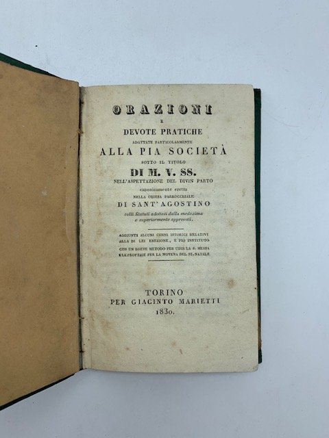 In 24 (cm 8 x 14), pp. 160. Legatura in mezza pelle coeva. Regolamento della Pia Societa' di Maria Santissima nell'aspettazione del Divin Parto, con pubblicazione del decreto arcivescovile, delle bolle pontificie delle indulgenze, delle memorie tratte da processi su due miracoli, litanie, inni, invocazioni. La Societa', che aveva lo scopo di aiutare le partorienti, aveva sede nella Chiesa di Sant'Agostino di Torino.
