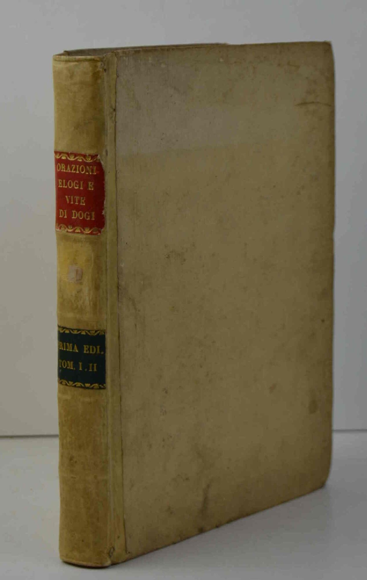 Due volumi legati in uno di cm. 26,5, pp. xvi, 262 (2); (4) 320. Solida legatura del tempo in mezza pergamena con nervi passanti e titoli in oro su doppio tassello bicolore. Qualche rada fioritura sparsa, peraltro esemplare genuino e ben conservato. Mancano (dall'origine) fra le preliminari le due carte segnate B2 e B3. Opera rara. Una sola copia censita in Iccu.
