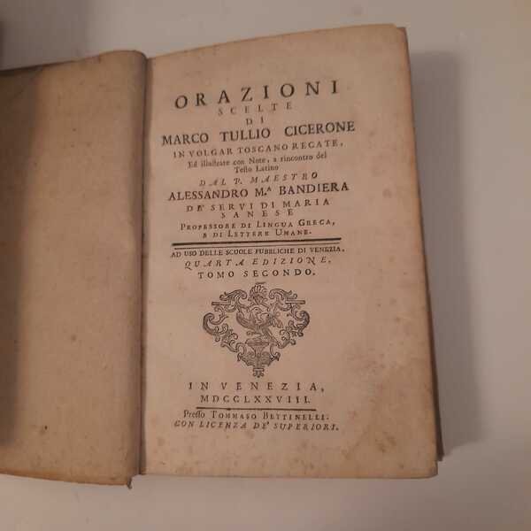 Tomo secondo ( Oraz. VII contro Lucio Catilina, VIII Contro Lucio Catilina recitata a Quiriti Ragionata,IX a difesa d'Aulo Licinio, X Recitata a' Quiriti, XI Recitata da Cicerone in Senato,XII a difesa della sua Casa, XIII A difesa di Gneo Plancio)