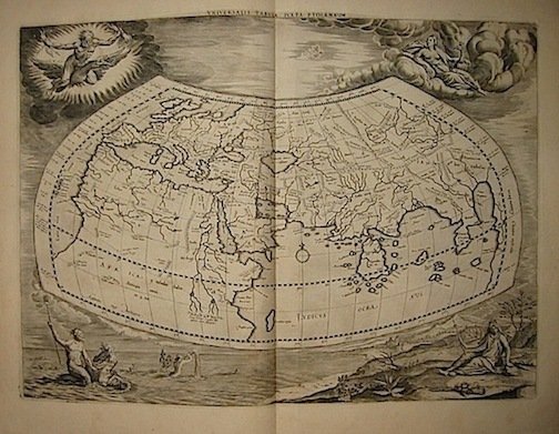 Folio (cm. 46), 6 cc.nn. compresa antiporta figurata, 28 carte geografiche a doppia pagina e 38 cc.nn. Frontis. stampato in rosso e nero con vignetta incisa. Una grande testata e due capilettera ornati. Legatura coeva in mz. pelle muta (usurata). Ottimi interni. Ultima edizione antica delle carte tolemaiche relative all’Universo, all’Africa, all’Asia e all’Europa. Koeman II, Me 8, Philips, 5751.