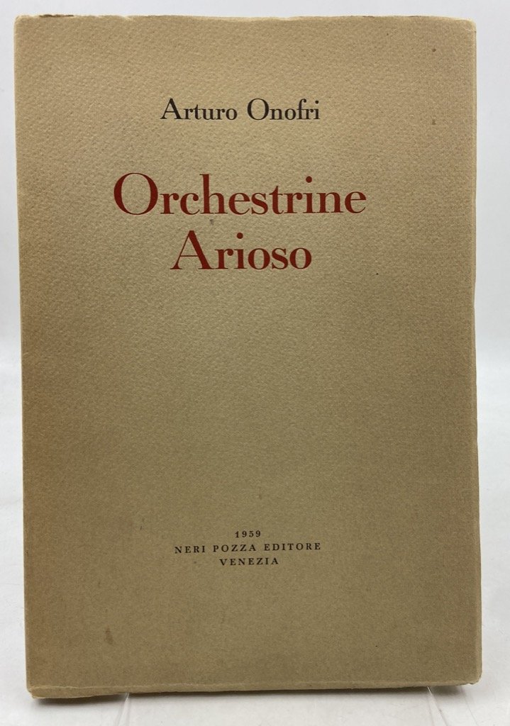 Brossura editoriale, cm 22 x 15, pp 138 (2). Poesia, volume undicesimo. Con una notizia critico-biografica di Giorgio Vigolo. Il volume raccoglie, secondo un progetto che l’autore abbozzò nel 1922 senza mai ultimarlo, le due sillogi Orchestrine (1917) e Arioso (1921), con una nota di Giorgio Vigolo. Stampato in 1000 esemplari numerati. Gambetti Vezzosi, p. 600.