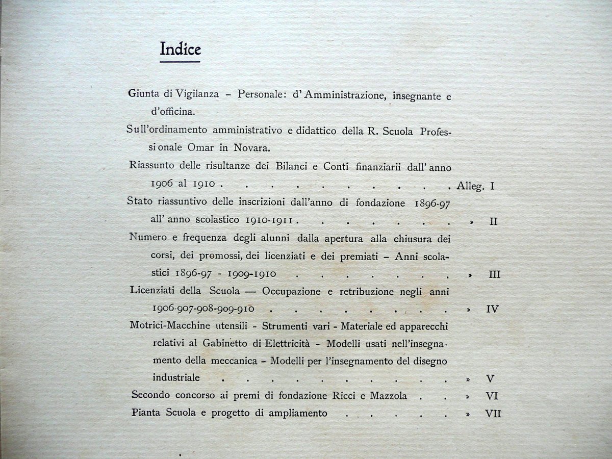 Relazione, Sull'ordinamento Amministrativo e Didattico della Regia Scuola Professionale Omar in Novara - Mostra delle Scuole Industriali e Commerciali Esposizione Nazionale di Torino 1911 Senza dati tip., Torino 1911; cm 33,5x24, pp. non num. (pp. 70) con qualche ill. in b/n e a col. fuori t., e qualche tabella rip. pi√π volte fuori t.; mancanza della brossura. Vecchio timbro al frontespizio. Condizioni di conservazione Esemplare in buone condizioni con tracce d'uso e alcune lievi bruniture; mancanza della brossura e allentamento delle cuciture; una pagina staccata dal corpo del testo (vedi foto). SC03.D12308 N