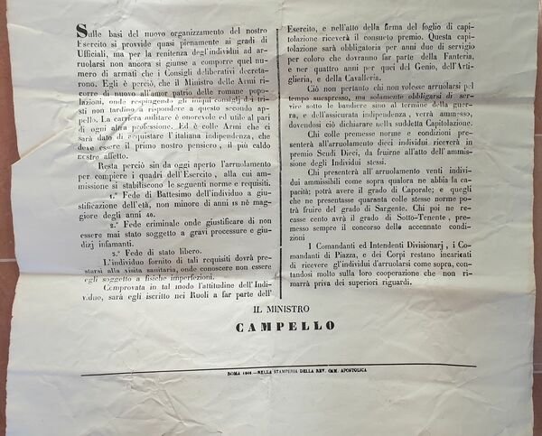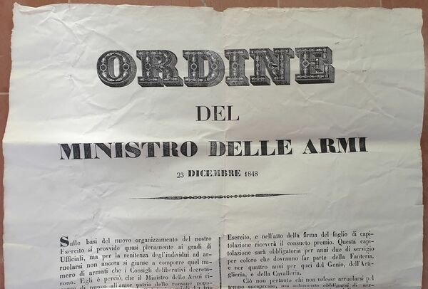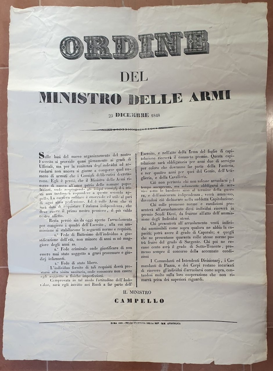 Rarissima locandina del 23 dicembre 1848, un ordine di arruolamento del Ministro Pompeo di Campello (Spoleto 1803-1884). L'appello è rivolto ai comandanti, intendenti divisionari e comandanti di piazza per la ricerca di persone che sarebbero andate a combattere durante la prima guerra d'Indipendenza. In base al numero di persone inserite il Ministro elenca i benefici promessi. In buone condizioni. Piegature. Di grandi dimensioni. 80x57 cmVery scarce poster of 23rd of december 1848, an order of Pompeo di Campello (Spoleto 1803-1884) to enlist poeple for the First War of Independence. The appeal is addressed to commanders and officiers In good conditions. Foldings. Of big size. 80x57 cm