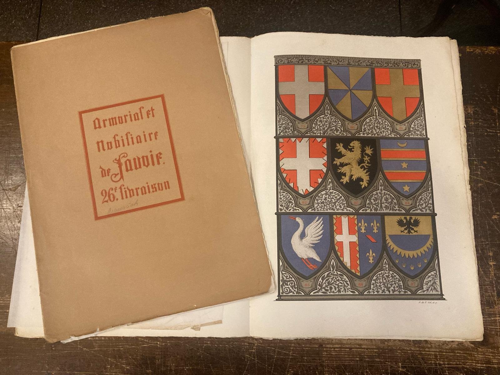 2 livraisons in-folio (420x292mm) del celebre armoriale sabaudo del Foras. Camicie editoriali in brossura con titolo impresso in rosso. Ogni fascicolo contiene 6 grandi tavole di blasoni splendidamente impresse in cromolitografia. Le tavv., protette da velina, recano al verso le legende esplicative. I due presenti fascicoli sono relativi all'Ordine dell'Annunziata. Ottimo stato. 'Le plus beau des nobiliaires français' (Saffroy). L'opera, di eccezionale importanza per gli studiosi di araldica savoiarda, italiana e svizzera, apparve in 6 volumi dal 1963 al 1938; incompiuto al momento della morte del Foras (1830-1899), il mastodontico lavoro venne portato a compimento dal Conte de Mareschal, dal Conte de Viry e da Le Bon d'Yvoire. Saffroy, 33749.