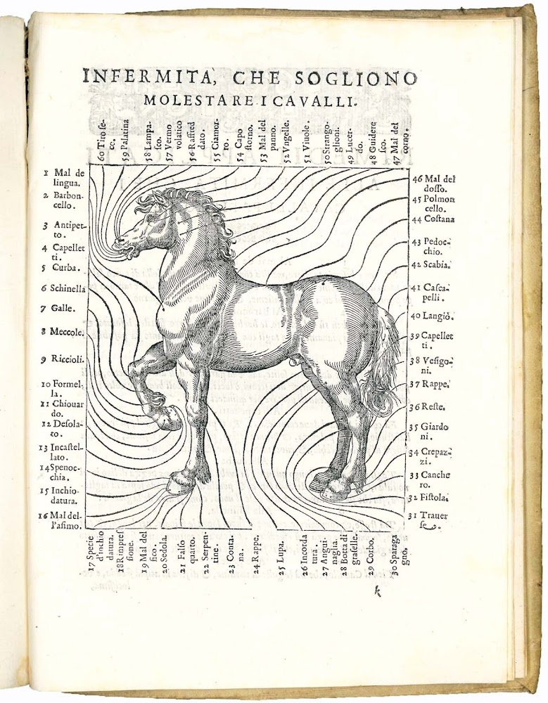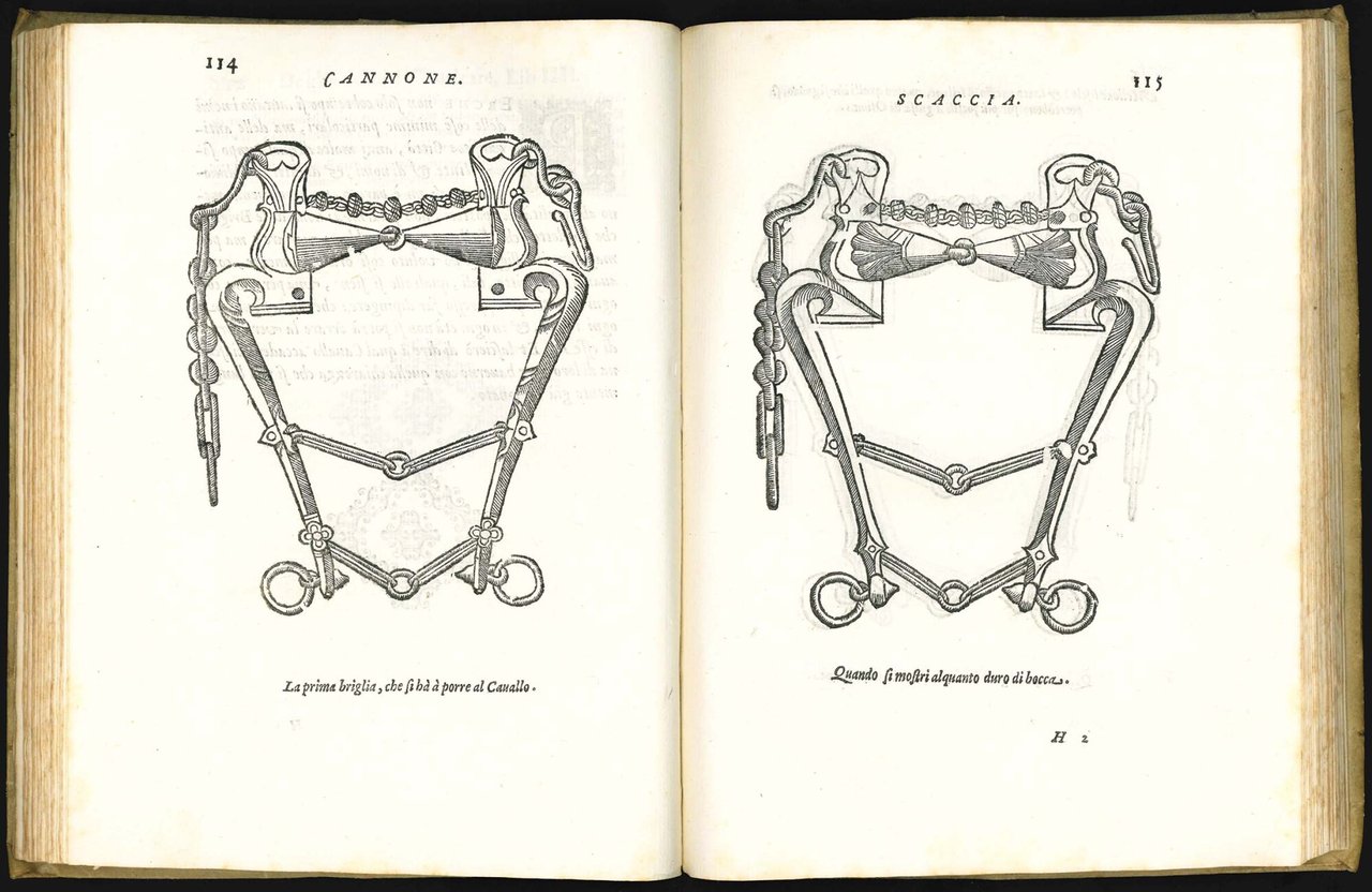 The first part contains full-page illustrations of various types of bites, with indication of their name and use (pp. 114-163), as well as two different types of riding (pp. 50 and 77). The second part deals with the anatomy of the horse and the proper treatment of the most common maladies afflicting the horse; to represent those diseases there is a full-page woodcut illustration of a horse.