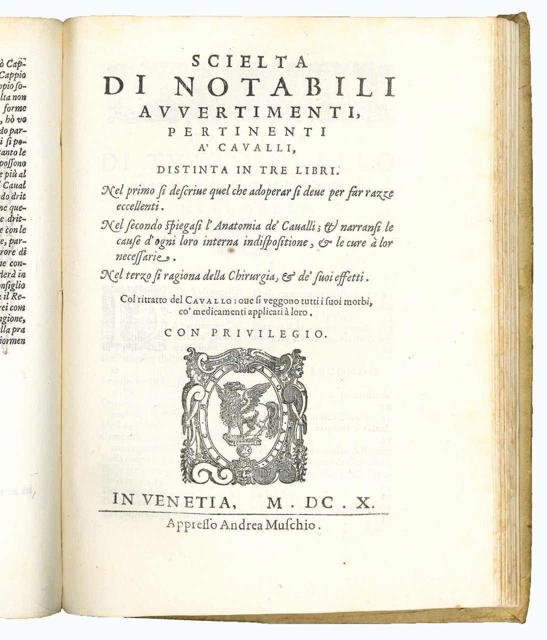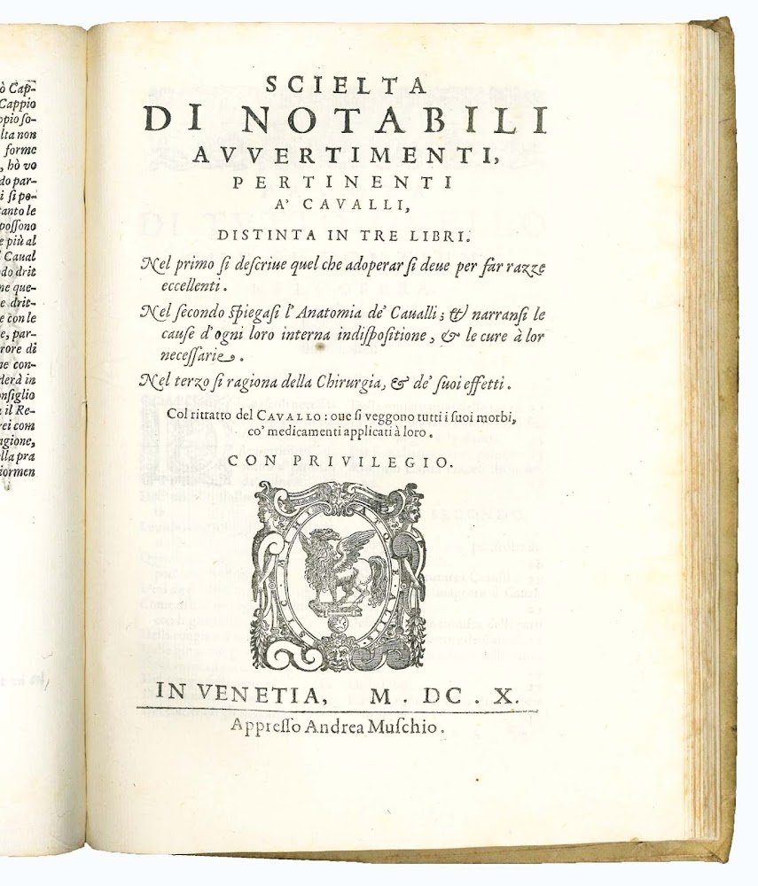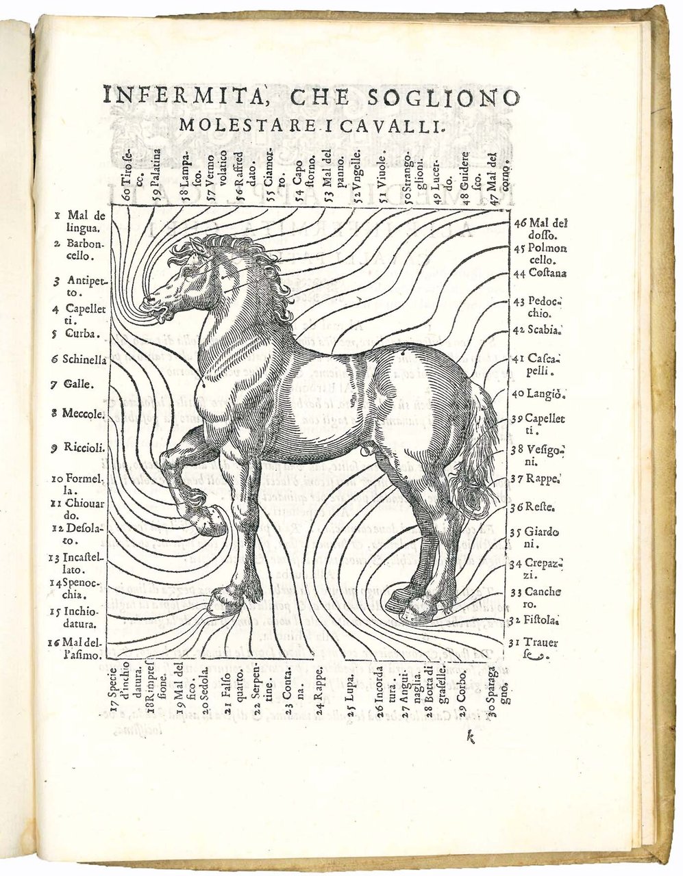 Two parts in one volume, 4to (220x170 mm). [12], 163, [1]; 70, [2 blank], [12] pp. Collation: †6 A-I8 K10; a-k4, l2. Leaf i4 is a blank. Printer's device on both title pages and 40 full-page illustrations in the text. Woodcut initials, head- and tailpieces. Italic type. Part two opens with a separate title page Scielta di notabili avvertimenti, pertinenti a' cavalli, distinti in tre libri. Contemporary limp vellum, inked title on spine. Two small stains on the first title page, otherwise a very good, genuine copy with wide margins.