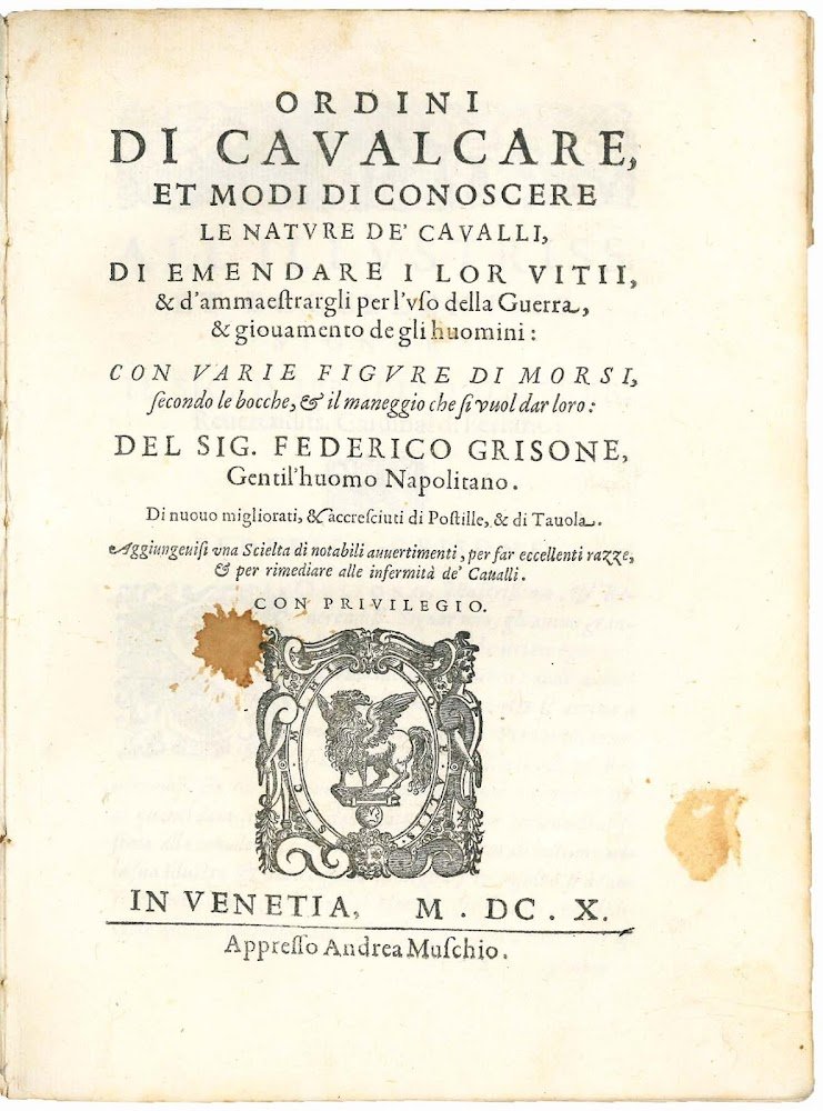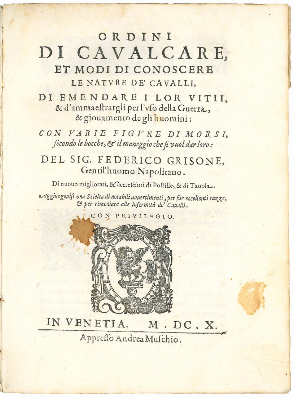 First seventeenth-century edition of this very successful treatise on horses and horsemanship that lays the foundations of modern indoor and outdoor riding. First published at Naples in 1550, it was reprinted over twenty times by the end of the 16th century and translated into all the major European languages.