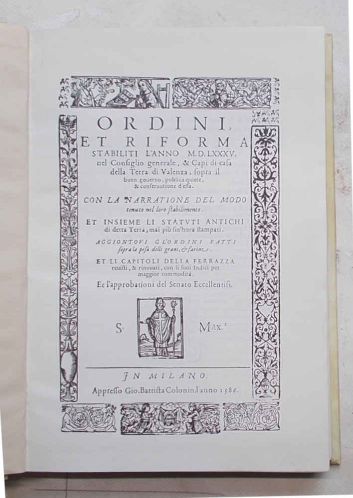 Ordini et riforma stabiliti l'anno M.D.LXXXV nel consiglio generale & Capi di casa della Terra di Valenza sopra il buon governo, pubblica quiete, et conservutione d'essa. et insieme li Statuti antichi di detta Terra mai più fin'hora stampati.