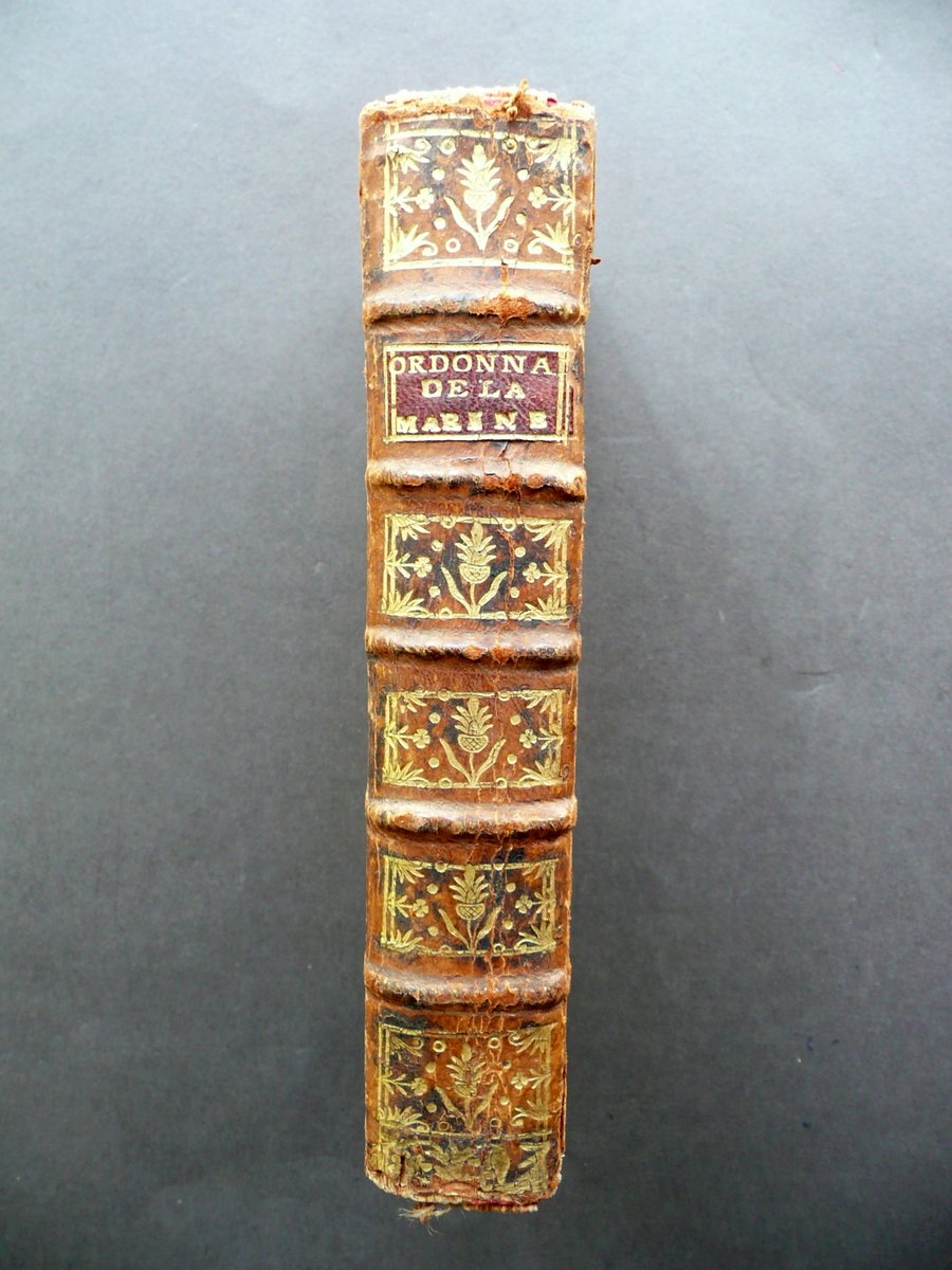 Ordonnance de la Marine Du mois d'Aout 1681 Commentée, et conférée sur les anciennes Ordonnances, le Droit Romain et les nouveaux Réglemens Nouvelle edition [.] Augmentée d'un extrait de l'Ordonnance de 1689, concernant la Police et la distribution des Vivres sur les Vaisseaux, le Lestage et Délestage, ecc. Et du réglement du 22 juin 1753, pour la Police et Discipline des Equipages des Navires expédies pour les Colonies de l'Amerique dont on a suivi de meme les textes de l'Imprimerie Royale Chez Prault - Cavelier - Saugrain et Cellot, Paris 1757; cm 17x10; pp. [12]; 530, con qualche capolettera e fregio incisi in b/n; legatura d'epoca in mezza pelle con titolo e fregi impressi in oro al dorso con nervature; tagli rossi; risguardi marmorizzati. Testo in francese. Condizioni di conservazione Esemplare ben conservato con tracce d'uso e del tempo, coperta con alcune leggere abrasioni, piccole mancanze principalmente ai margini, agli angoli dei piatti e alle cuffie, alcune leggere macchiette. Interni buoni con alcune piccole lievi bruniture e normali leggere ingialliture del tempo ad alcune pagine; angolo inf. delle pp. 51-52 con una piccola mancanza; margine est. delle pp. 513 con una irregolarità (difetto tipografico) che non compromette la lettura del testo. La celebre Ordonnance Colbert", punto di partenza per il diritto pubblico marittimo, che codificò gli usi della navigazione e del commercio in tale settore. SETT131.L13136 N P "
