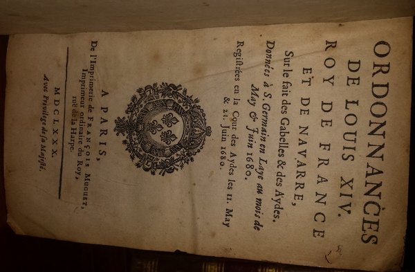 In-12 (15 cm) tre opere in un volume 163 (5); (4) 236 (4); 108 stemmi reali al frontespizio. Piena pelle con caratteri e fregi in oro al dorso. Lieve asportazione al piatto anteriore. Qualche fioritura.Collazionato e completo. Ordinanze ufficiali sulle imposte e su altri problemi interni. Interessante documento conteporaneo sulla politica interna della Francia durante il governo di Re Sole. Luigi XIV (Louis-Dieudonné) (Saint-Germain-en-Laye, 5 settembre 1638 – Versailles, 1° settembre 1715) detto il Re Sole (in francese Le Roi Soleil), terzo della casa di Borbone della dinastia capetingia, regnò come re di Francia e re di Navarra dal 14 maggio 1643 alla sua morte. French language, lingua francese.
