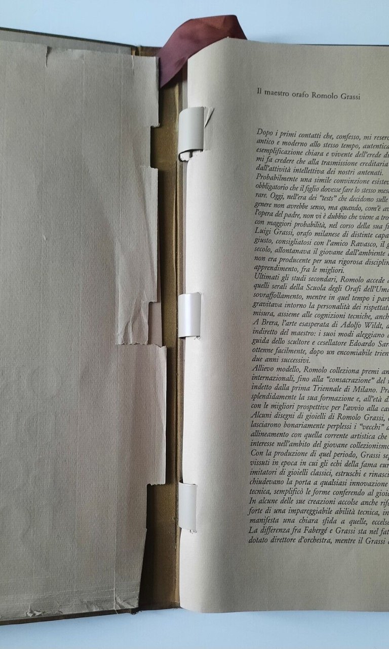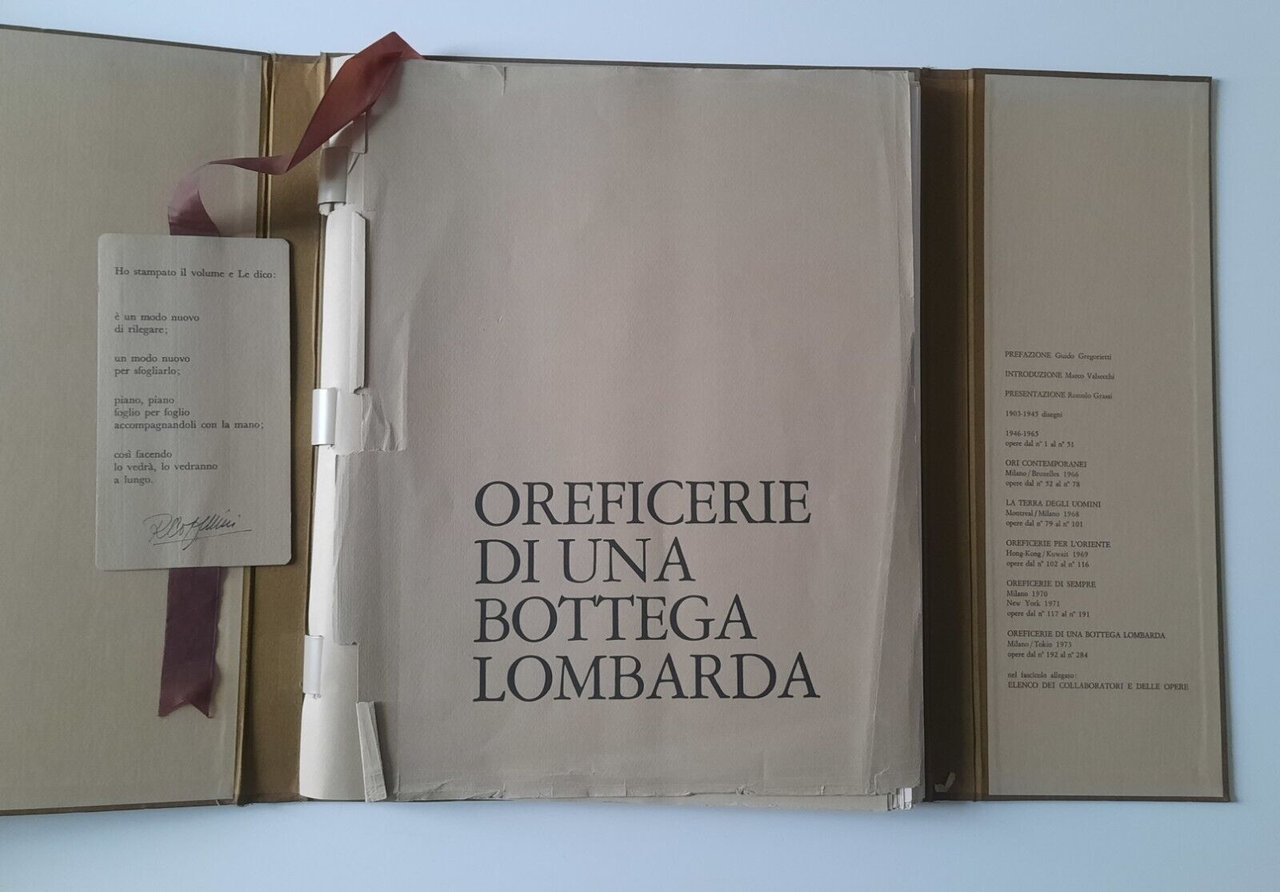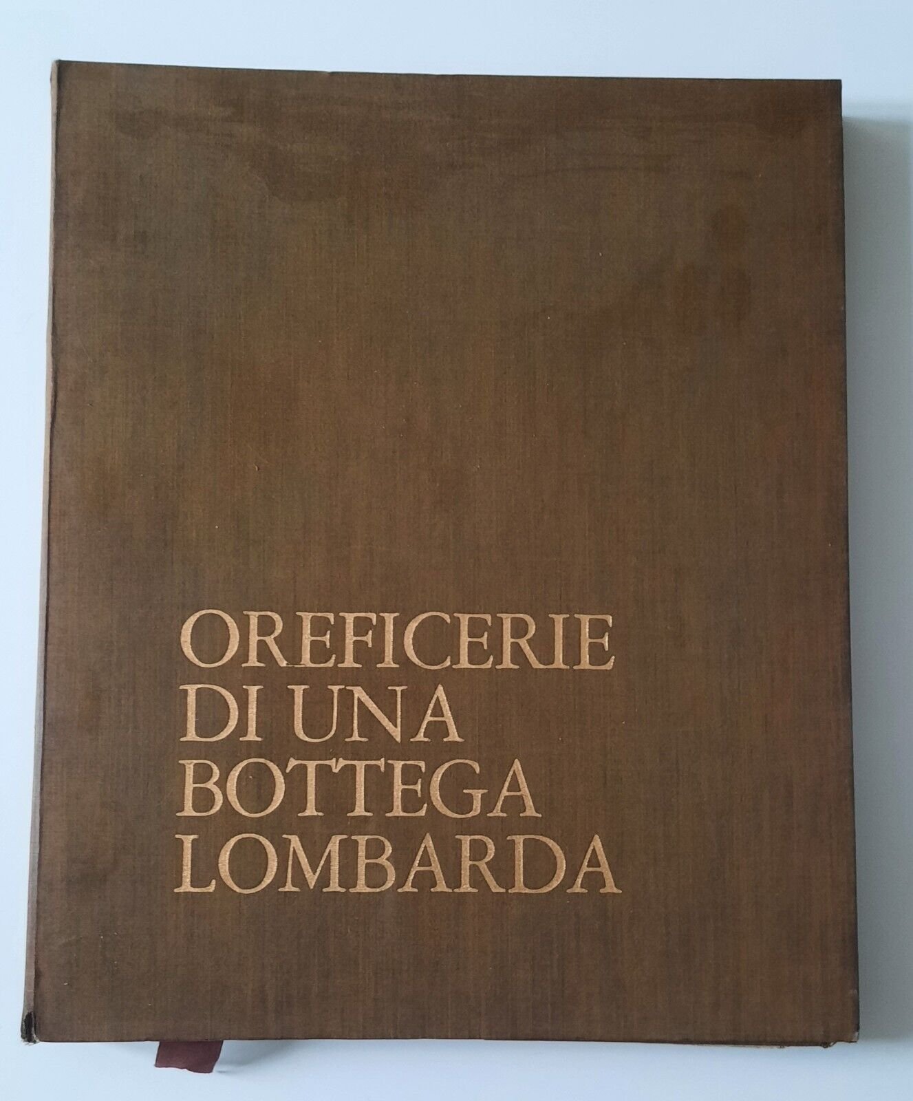 OREFICERIE DI UNA BOTTEGA LOMBARDA ROMOLO GRASSI CAPELLINI 1974In folio, 32x 40, legatura editoriale con anelli, copertina portfolio telata con titolo in oro al piatto, ill. a colori e in b/n.Lievi segni alla copertina, distacco della prima pagina, pagine fresche e pulite.