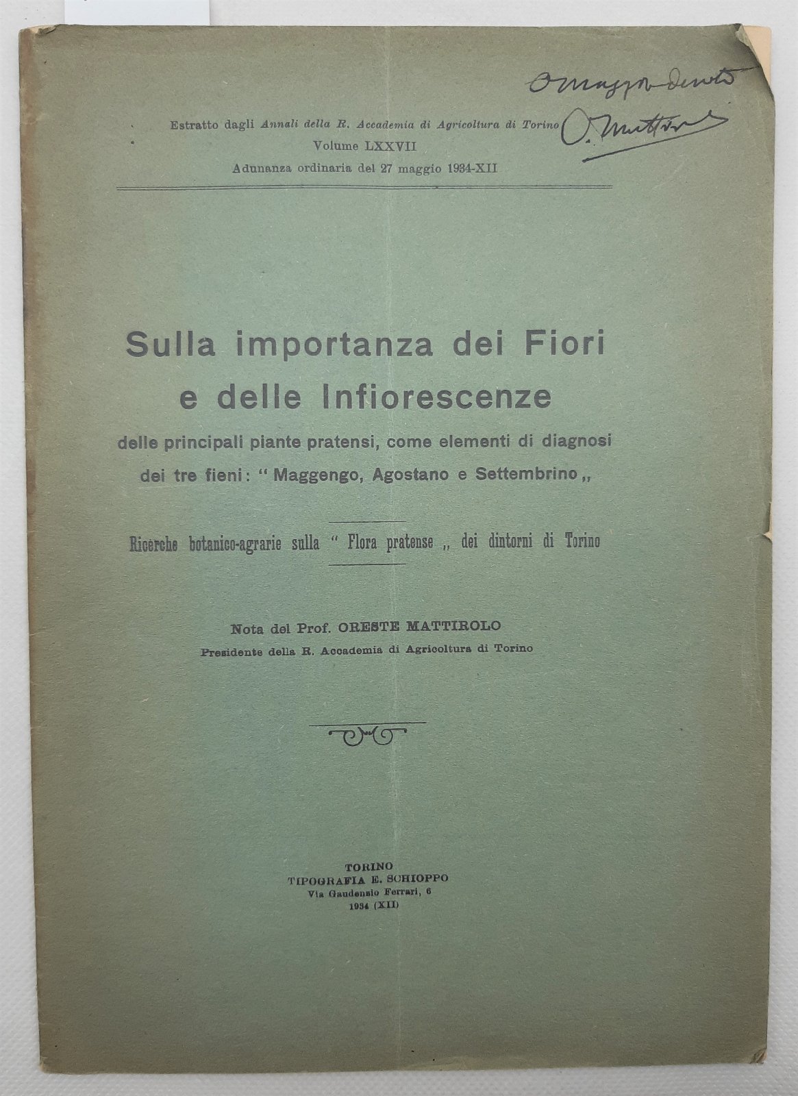 Oreste Mattirolo Sulla importanza dei fiori e delle inflorescenze Torino 1934 autografato