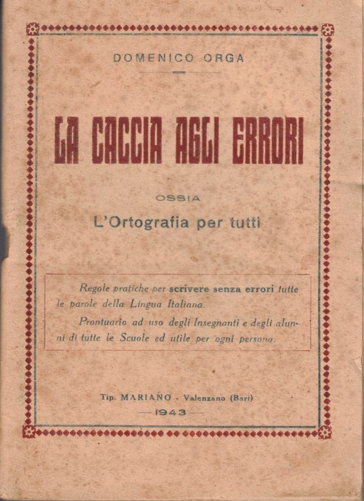 Domenico Orga, La caccia agli errori ossia L’ortografia per tutti. Regole pratiche per scrivere senza errori tutte le parole della Lingua Italiana. Prontuario ad uso degli Insegnanti e degli alunni di tutte le scuole ed utile per ogni persona, Tip. Mariano, Valenzano (Bari) 1943, pp. 76, cm 17, pubblicazione spillata. Minime fioriture, leggera ombra di vecchia gora di al margine esterno delle prime carte, per il resto molto ben conservato. Raro.