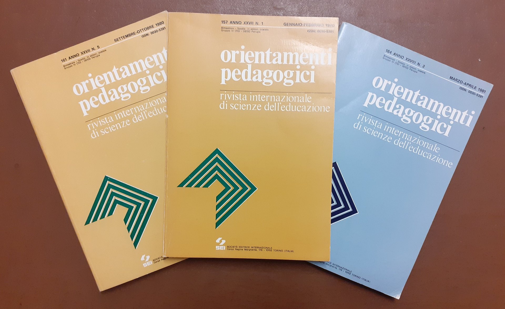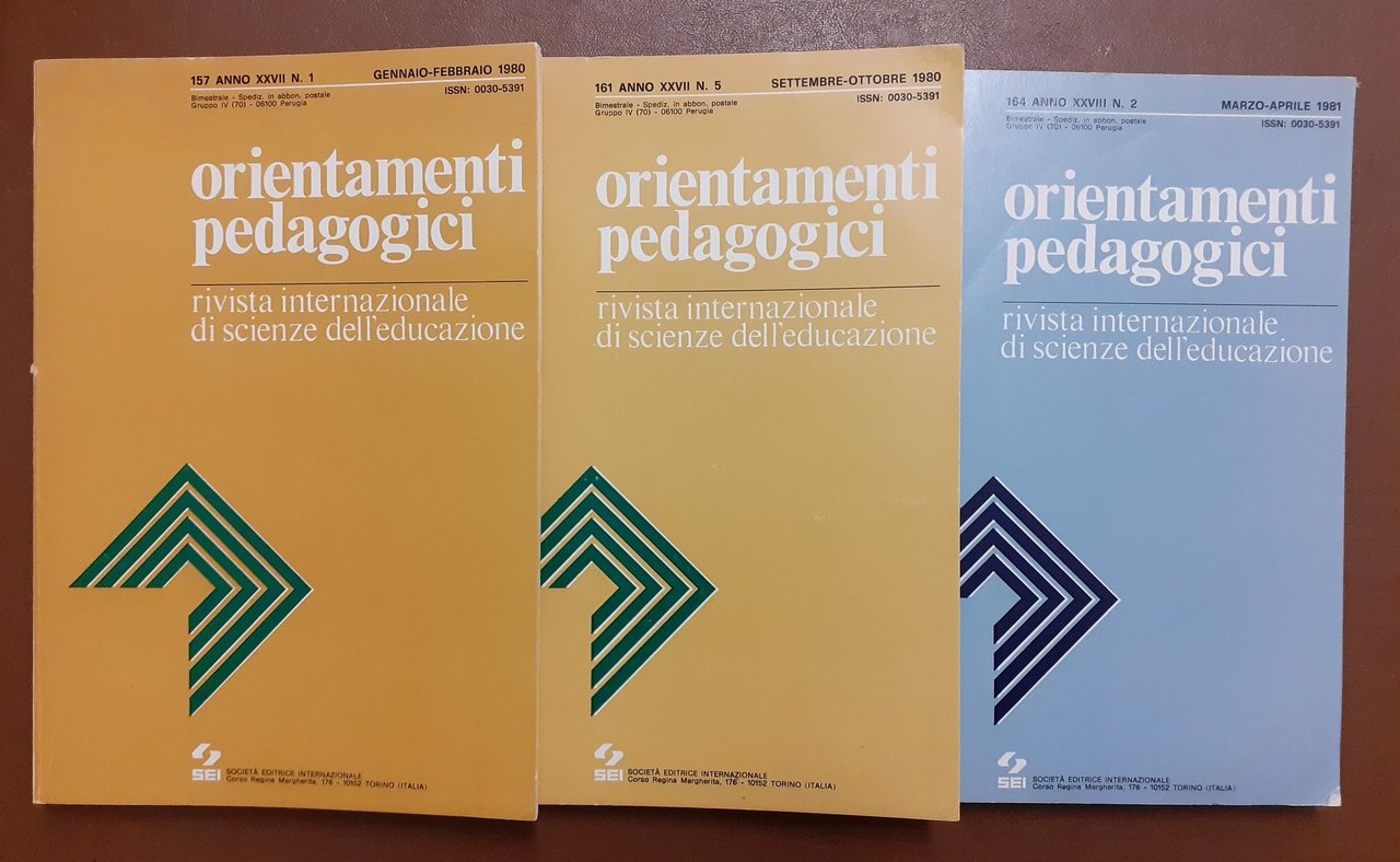 Orientamenti pedagogici. Rivista internazionale di scienze dell’educazione, a cura della Facoltà di Scienze dell’Educazione dell’Università Salesiana di Roma, Società Editrice Internazionale, Torino, anni XXVII-XXVIII, 1980-1981, 3 numeri, pp. totali 539, cm 24, br. ed. Il lotto comprende i seguenti tre numeri della rivista Orientamenti pedagogici: a. XXVII, n. 1 (157), gennaio-febbraio 1980 (pp. 187) – a. XXVII, n. 5 (161), settembre-ottobre 1980 (pp. 780-954) – a. XXVIII, n. 2 (164), marzo-aprile 1981 (pp. 188-364). Indici. A. XXVII, n. 1 (157), gen-feb. 1980: A. Ronco, A. Vincenti, Religiosità adolescenziale, stima di sèé e percezione dei genitori – K. Polácek, S. Sarti, Chiarificazione dei tipi professionali e ambiente scolastico – L. V. Castellazzi, A proposito della psicodiagnosi – C. Bissoli, catechesi ed educazione – C. Gagliardi, Il dettato secondo una metodologia sistemica – G. Salonia, Verifica sperimentale di un programma di training sulla comunicazione interpersonale – G. Groppo, Cauto rinnovamento e integrità dei contenuti nella Catechesi tradendae di Giovanni Paolo II – G. Malizia, Le nuove tendenze della pianificazione e della gestione degli istituti di istruzione superiore – G. Chávez, La socializzazione politica in età evolutiva. Rassegna di studi psico-sociologici – Orientamenti bibliografici (Recensioni – Segnalazioni). A. XXVII; n. 5 (161), sett.-ott. 1980: G. Groppo, Psicologia e teologia. Modelli di rapporto – K. Polácek, F. Furnari, Differenziazione dei tipi professionali e controllo interno – L. Boncori et al., Valori e classe sociale: indagine sulla maturazione di preadolesenti – C. Nanni, Qualità della vita e qualità dell’educazione – G. Saraiva De Franca, Politica educativa del Brasile di oggi – J. M. Quintana Cabanas, Prensa infantily educación informal – B. Pojaghi Palmieri, Il ruolo dell’insegnante nell’inserimento scolastico del bambino cieco – S. Troisi, S. Rinaldi, Il ruolo dello psicologo nei consultori familiari: ricerca nella città di Roma – E. Alberich, Annunciare il vangelo ai ricchi? Incontro dell’Equipe Europea di catechesi, Lisbona 25-31 maggio 1980 – Orientamenti bibliografici (Recensioni – Segnalazioni). A. XXVIII, n. 2 (164), mar.-apr. 1981: A. Arto, Impostazione e metodo di studio dei problemi evolutivi – R. Mion, Sinodo ’80: famiglia e Chiesa. Indagine socio-religiosa nelle parrocchie di Roma. I: concettualizzazione della problematica – Questione morale, educazione e scuola. Intervento di B. Bellerate – G. Proverbio, Educare alla comunicazione – C. Bazzanella et al., Educazione linguistica: presupposti per una progettazione didattica interdisciplinare – G. Malizia, Stratificazione, mobilità sociale e sistema scolastica – M. G. De Francisci, L. Rossi, S. Troisi, Descrizione di un intervento nella scuola materna per prevenire il disadattamento dei bambini – Orientamenti bibliografici (Recensioni – Segnalazioni). Lievi tracce d’uso alle brossure, minima brunitura della carta, per il resto ottimi esemplari.