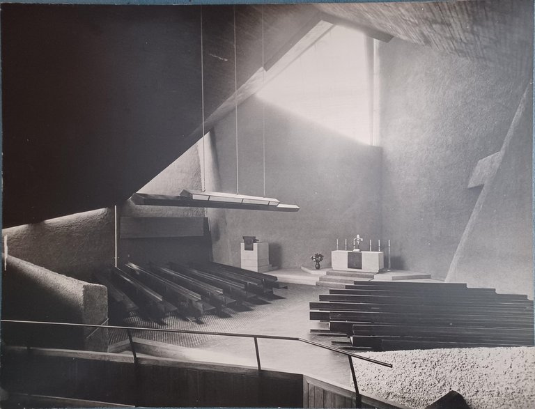 Der Berliner Architekt Hermann Fehling (1909-1996) zeichnete für viele herausragende Bauten in West-Berlin nach 1945 verantwortlich. So etwa für das Studentendorf Schlachtensee (Gebäudeensemble), das Institut für Hygiene und Mikrobiologie der Freien Universität Berlin und das Max-Planck-Institut für Bildungsforschung, allesamt Beispiele für die sogenannte Nachkriegsmoderne in Deutschland und heutzutage als erhaltenswerte Denkmäler eingestuft. Seit Anfang der 1960er Jahre war Hermann Fehling auch Mitglied der Akademie der Künste (Berlin/West). Hier liegt eine originale Ausstellungstafel zu einem der Gebäude vor die Fehling mit seinem Partner Gogel geschaffen hat. Es handelt sich hier um eine fotografische Ansicht des Innenraums der um 1960 gebauten Paul-Gerhardt-Kirche in Berlin-Schöneberg, damals Westberlin. Die Ansicht zeigt die moderne Gestaltung des Kircheninnenraumes in schwarz/weiss. Die großformatige Tafel war höchstwahrscheinlich Teil einer Ausstellung des Architekturbüros Fehling + Gogel in den 1980er Jahren. Sie zeigt das architektonische Werk noch im originalen Zustand. Original-Ausstellungstafel aus dem Nachlaß des bedeutenden Architekten Hermann Fehling!
