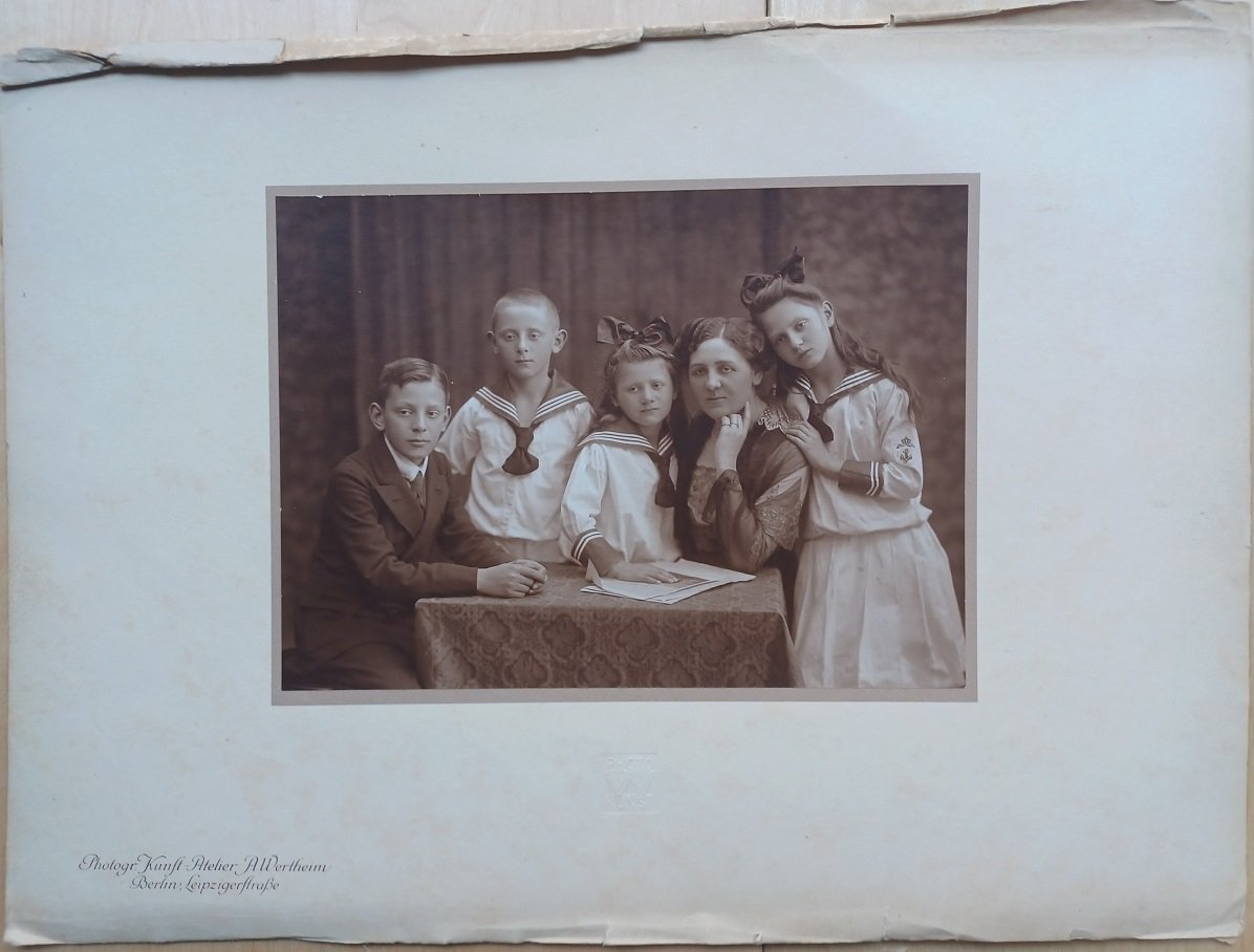 Original-Photographie aus dem Photogr. Kunst-Atelier A. Wertheim in der Leipziger Straße. Die Aufnahme liegt im Großformat vor. Bildfläche: 16,8 x 22,8 cm. Das Porträt zeigt eine Mutter mit ihren vier Kindern. Notat auf der Rückseite (Bleistift): "1938/4 eilt". Ob damit tatsächlich die Jahreszahl gemeint ist läßt sich nicht feststellen, die Aufnahme könnte ebenso gut aus der Kriegszeit stammen was den fehlenden Vater erklärte. - - - ACHTUNG! Dieses Buch kann wegen seines Gewichts oder seiner Größe nur als PAKET verschickt werden. Innerhalb Deutschlands 5,80 Euro. (Portokosten ins Ausland bitte erfragen.) ATTENTION! Due to its weight or size this book can only be sent as a PARCEL. Within Germany 5,80 Euro (For shipment abroad please ask.)